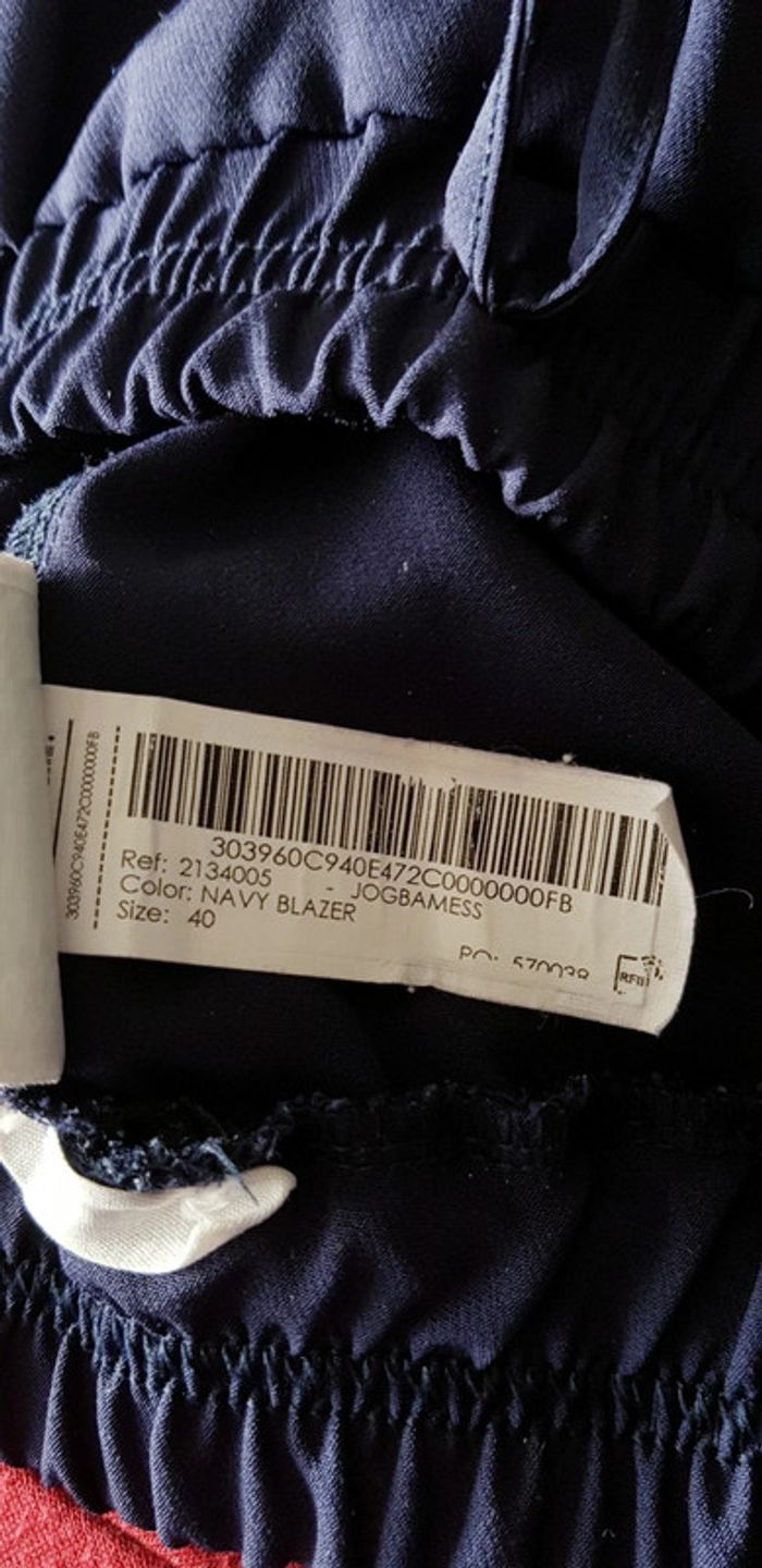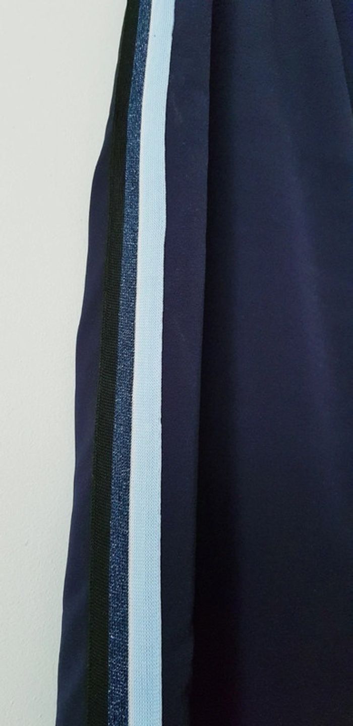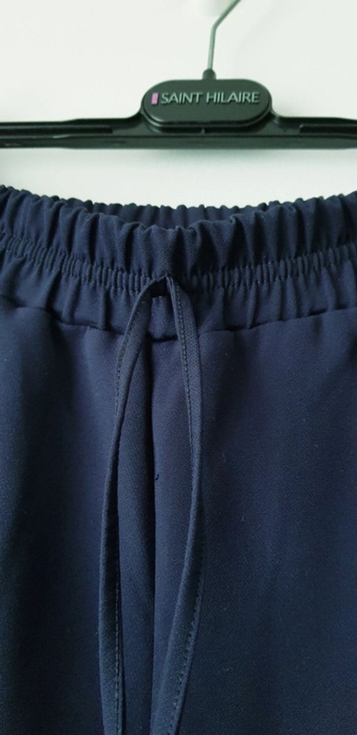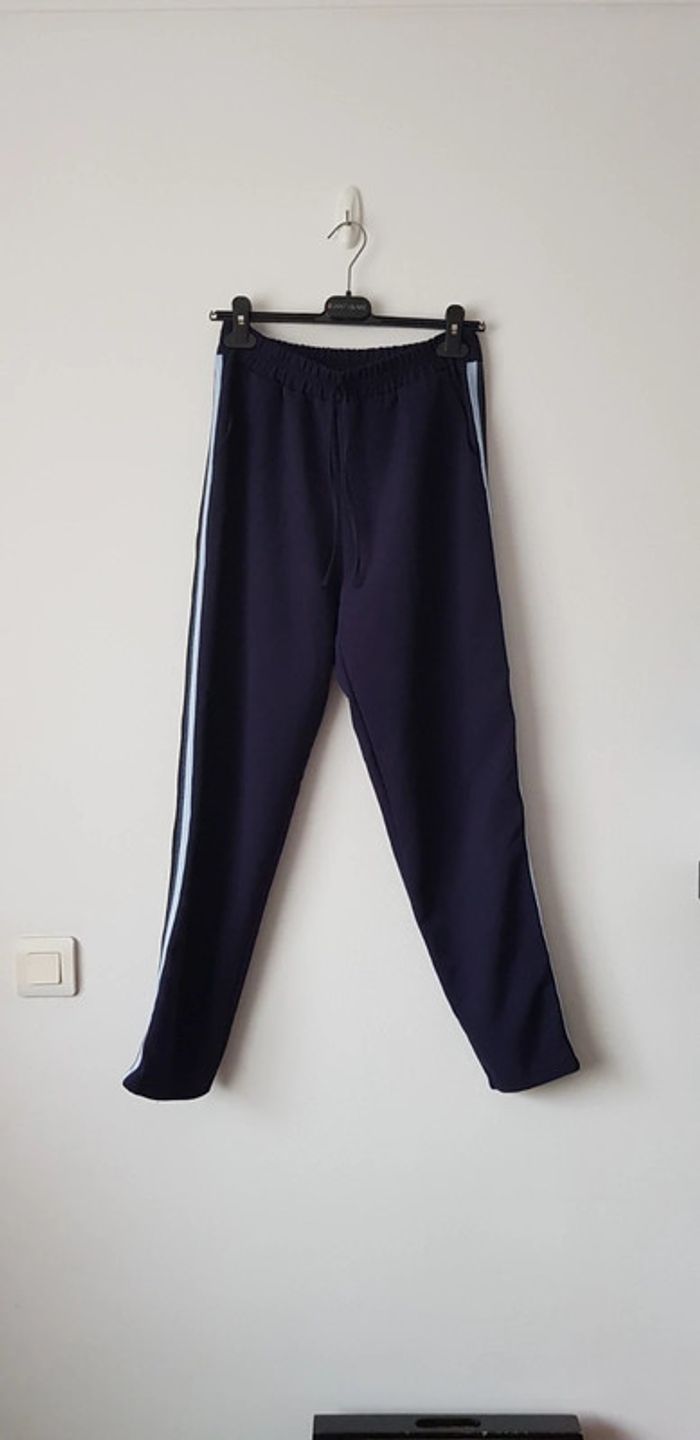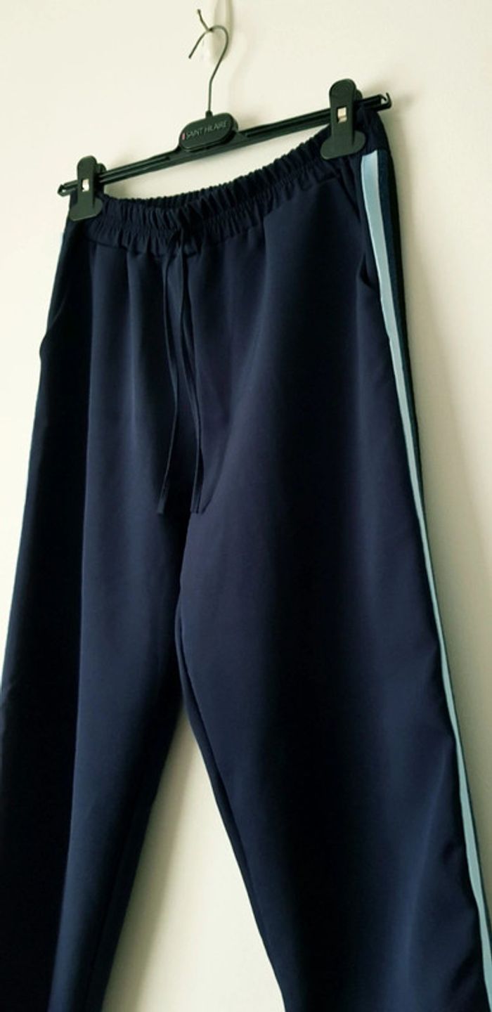 Pantalon souple style jogging bleu marine, jambes un peu large et taille élastiquée, bandes de tissus sur les côtés - T. 40 - TRÈS BON ÉTAT.