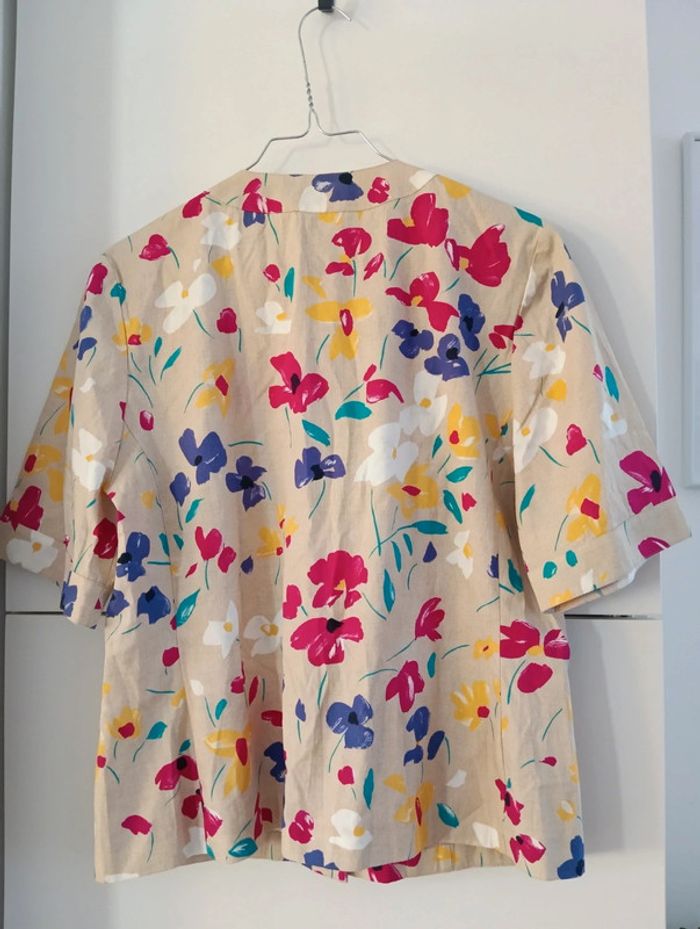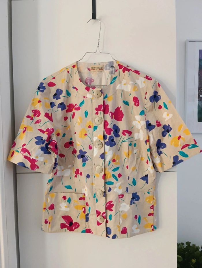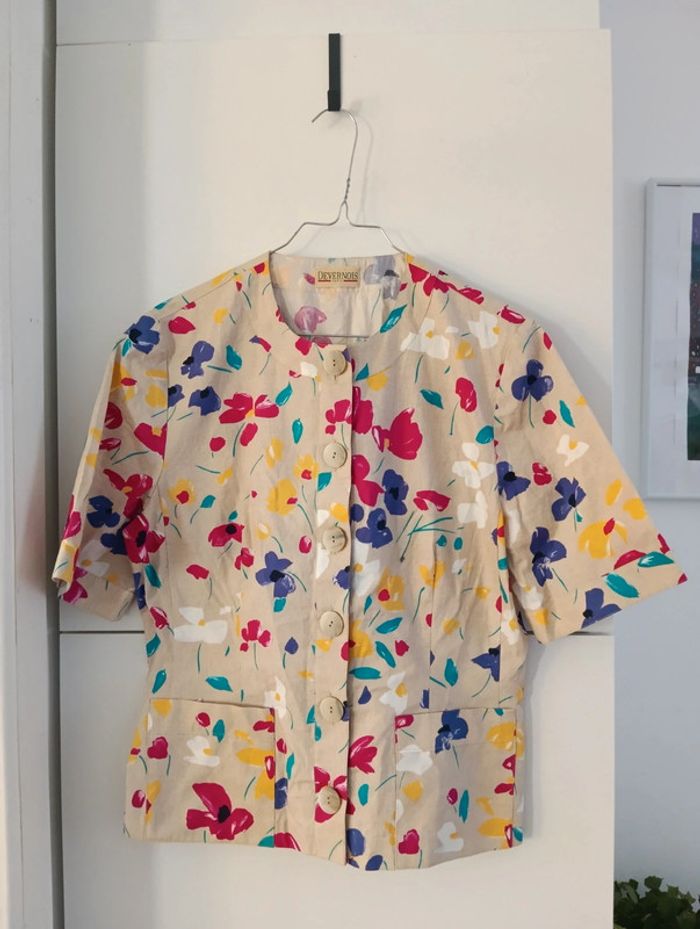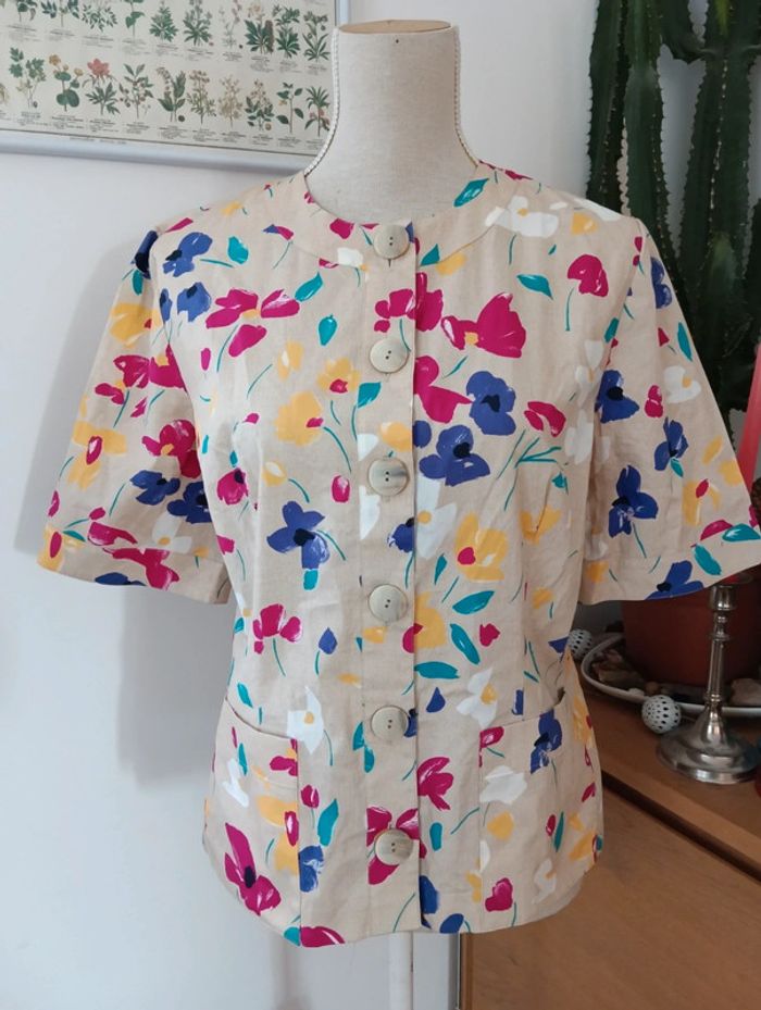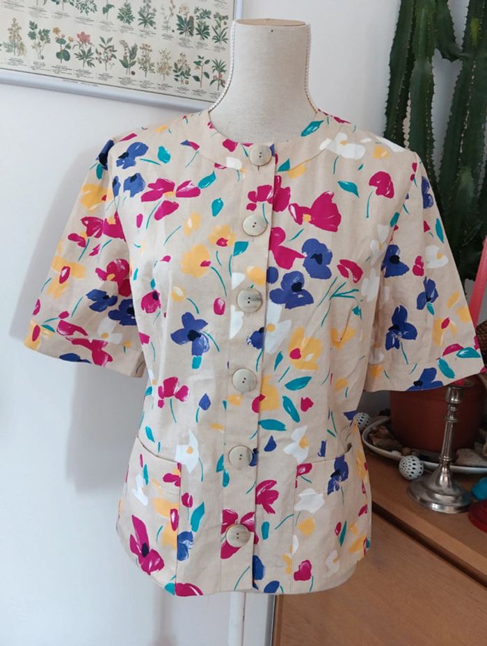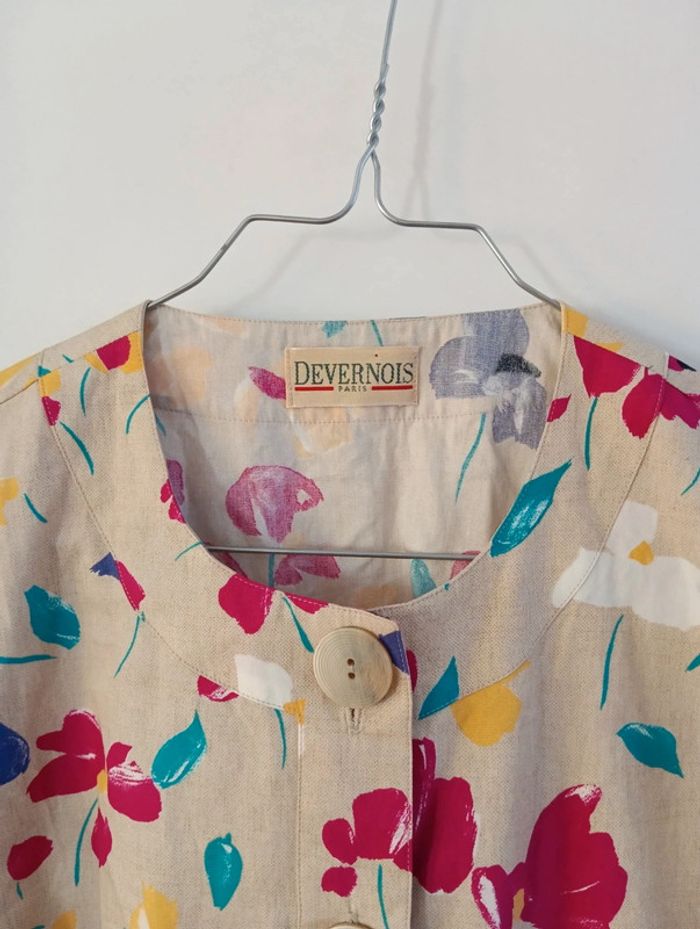 Blouse fleurie vintage Écrue, fleurs multicolores. Boutonnée,col rond. 100% coton, De la marque Devernois. Très belle qualité, en parfait état. Taille 38/40 estimée à confirmer avec les mesures Epaules 40cm Aisselles 52cm Longueur 59