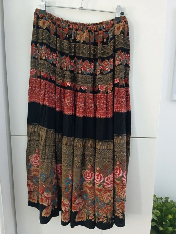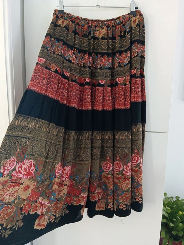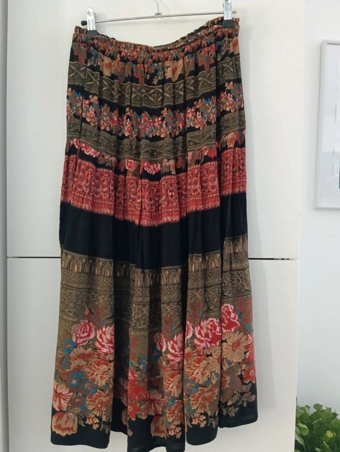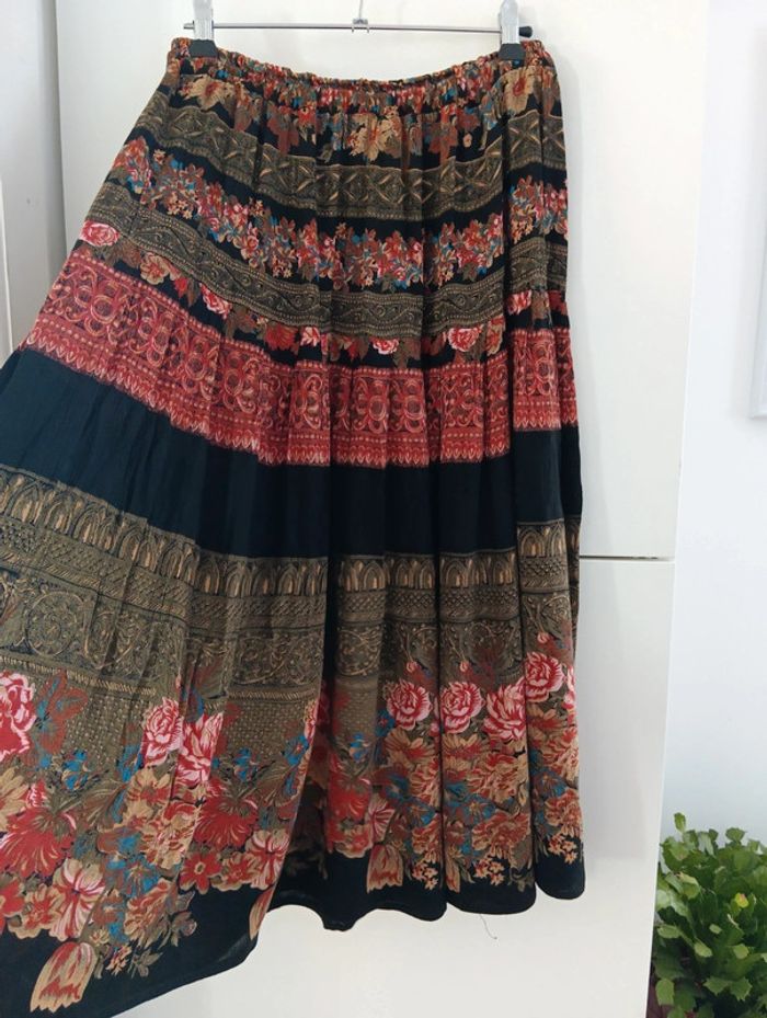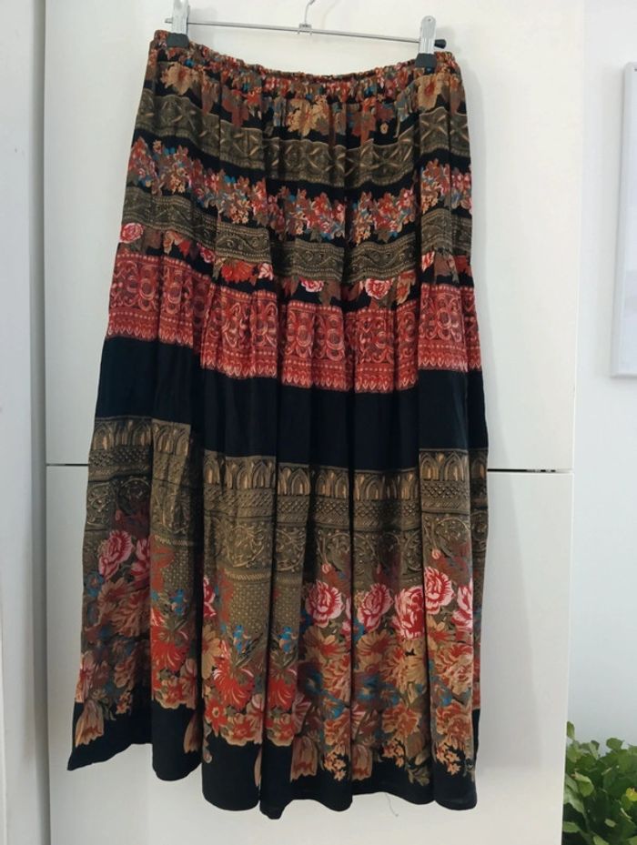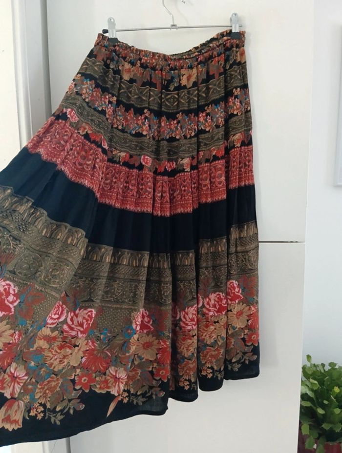 Jupe en viscose ,jolie amplitude. Kaki/rose multicolore Aucune étiquette. Longueur midi 77cm Taille élastique extensible de 33 à 55cm