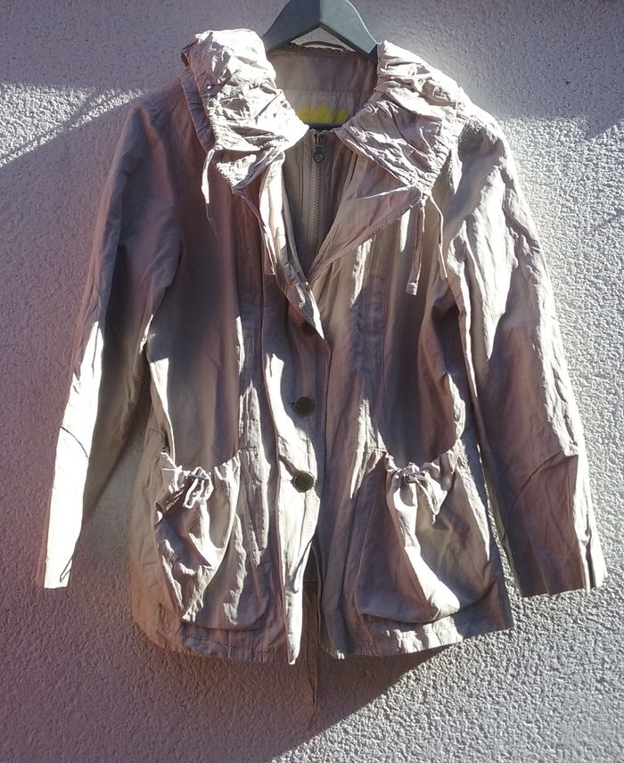 Veste Outdoor originale Betty Barclay de qualité, beige-crème, fermeture zippée et boutonnée, double col avec possibilité de fronçage, 2 poches et lien de serrage, dos élastiqué avec cordon.