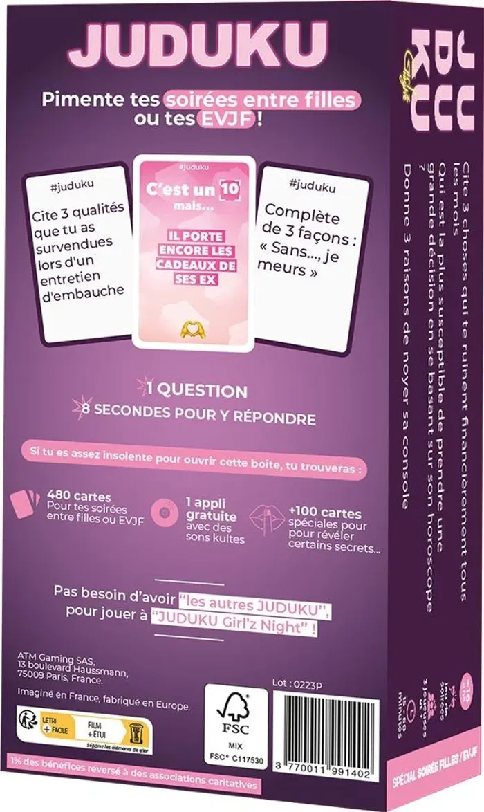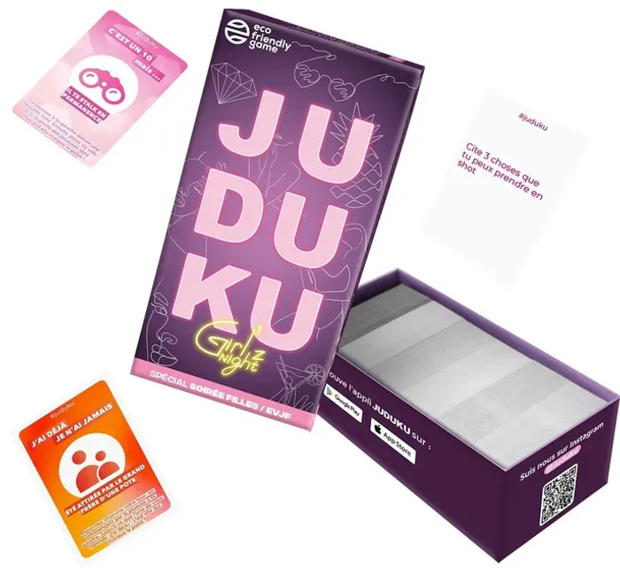 La description Révèle, en 8 secondes, les pires pensées de tes amies avec des cartes demandant de la spontanéité, peu de morale et aucune retenue ! La première joueuse qui marque 7 points est élue "Queen du Juduku" ! Juduku "Girl'z Night" est la première édition de Juduku écrite par des filles pour les filles. Le jeu comporte 480 cartes délirantes dont 120 cartes spéciales exclusives aux soirées "Girls only" La joueuse au QI le plus faible est désignée Queen du Juduku. Elle pioche la première carte et pose la question à une joueuse qui a 8 secondes pour y répondre. Si les réponses sont acceptées par la Queen du Juduku alors la joueuse qui a répondu marque 1 point. La gagnante devient à son tour la Queen du Juduku. C’est à elle de poser une question à la joueuse suivante, jusqu'à ce qu'une des joueuses marque 7 points et l'emporte. Cette version, spécialement conçue pour les filles par des filles, contient des questions "classiques" du style : -Cite 3 choses qui te ruinent financièrement tous les mois -Cite 3 habitudes bizarres que tu as avant un date Et 5 catégories de cartes spéciales inédites: -Qui est la plus susceptible de croiser ses ex sur Tinder? -J'ai déjà/Je n'ai jamais flirté avec quelqu’un alors que j'étais en couple -C'est un 10 mais il pense que Kylie Jenner est naturelle