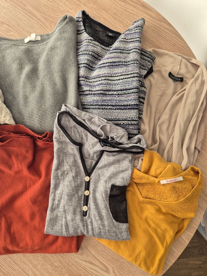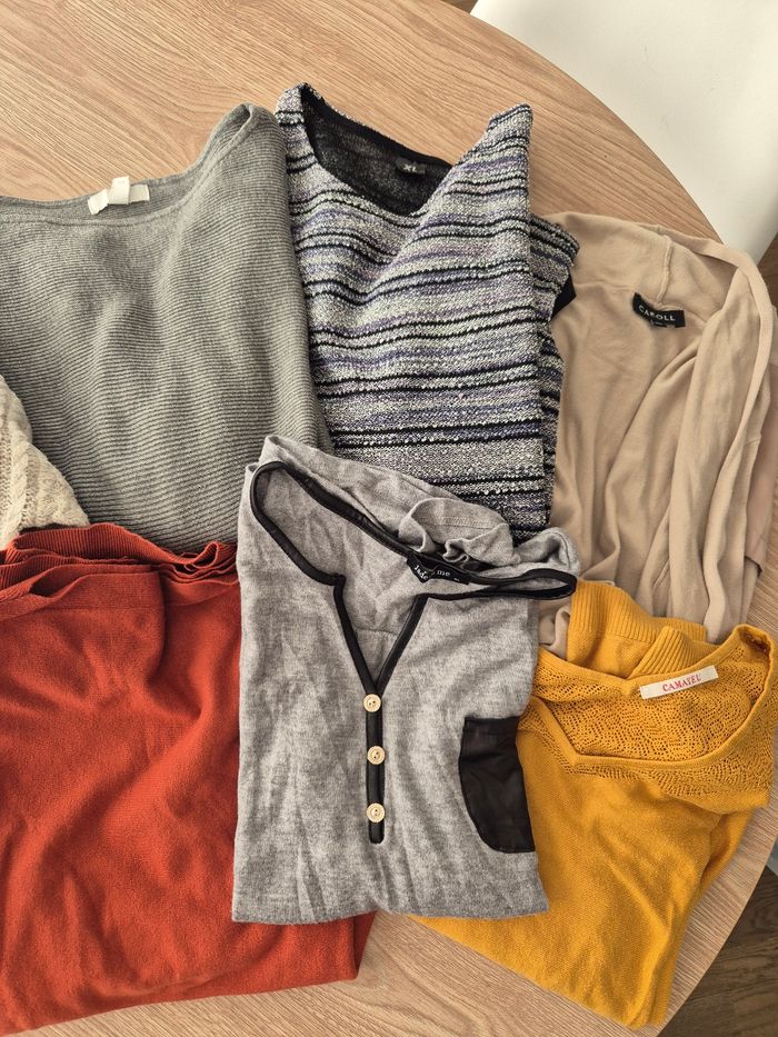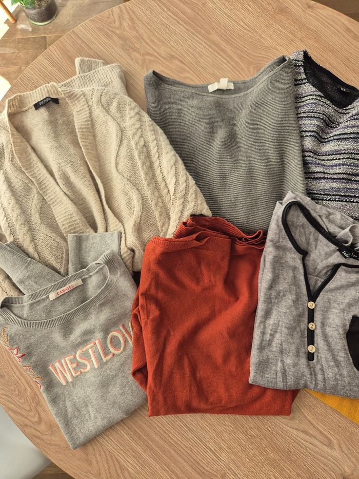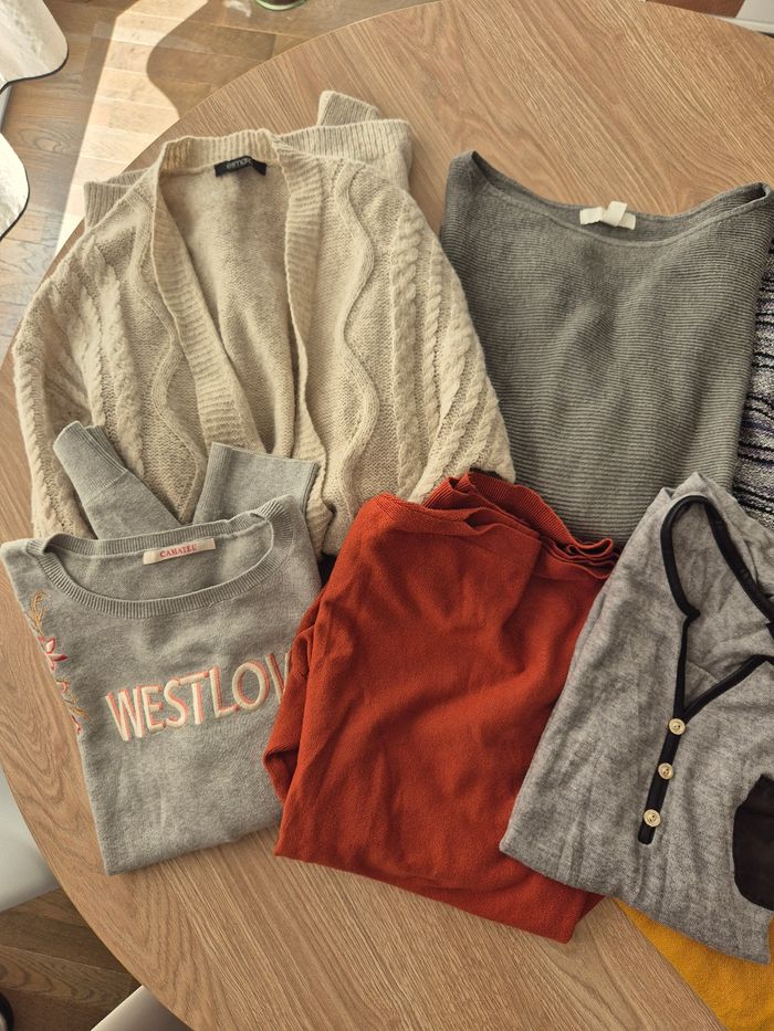 6 pulls *Taille L/XL - très bon état 2 gilets *Taille 38 - bon état Marques : camaïeu, h&m, jade&moi...