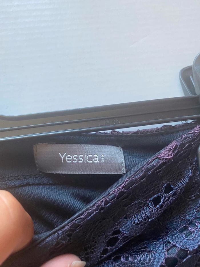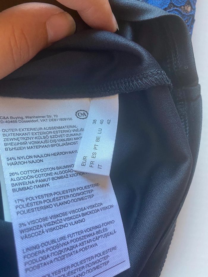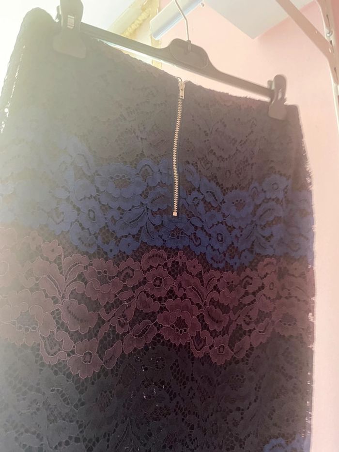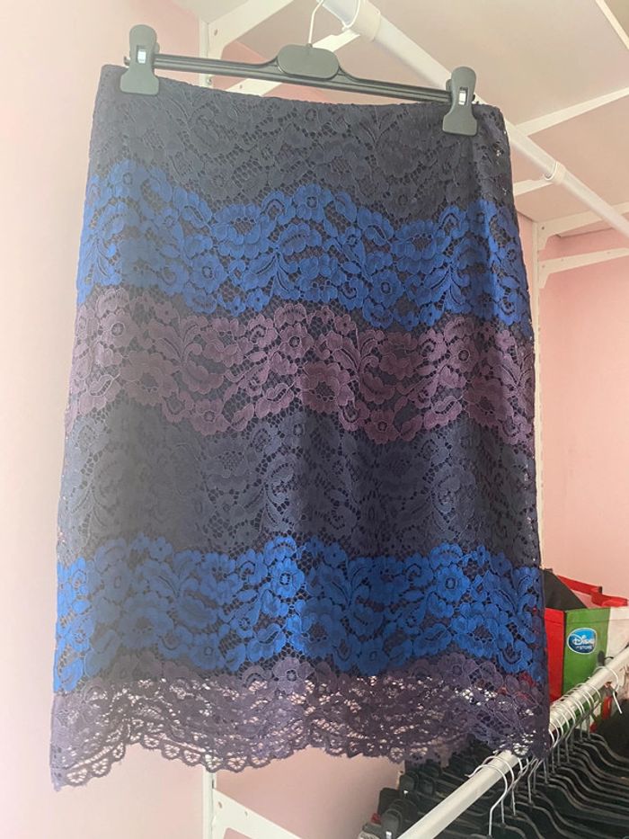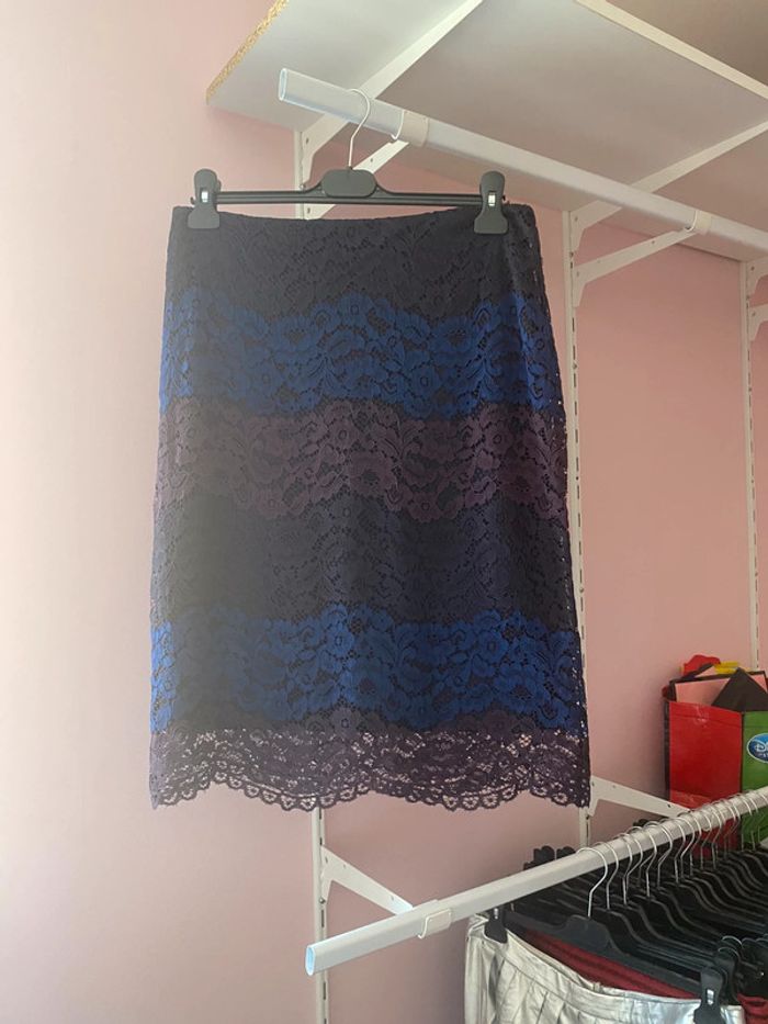 Jupe crayon en dentelle taille 40 de couleur bleu et violet avec doublure à l’intérieur et fermeture sur le derrière