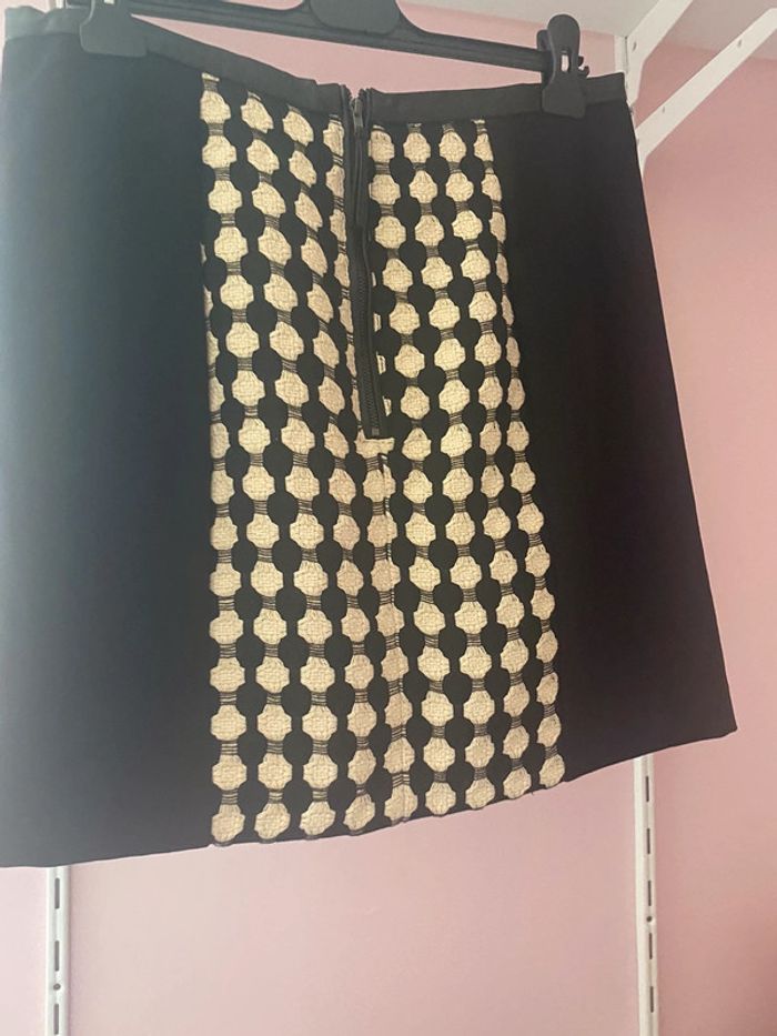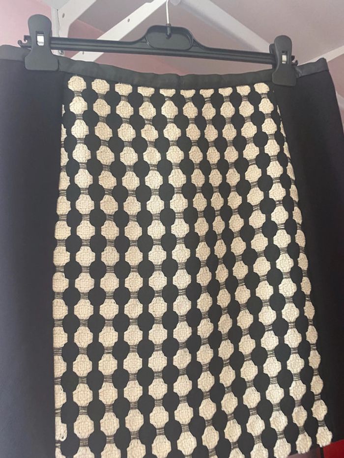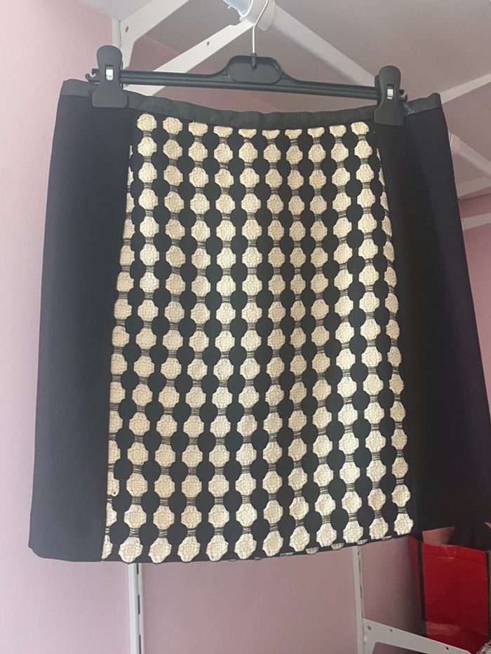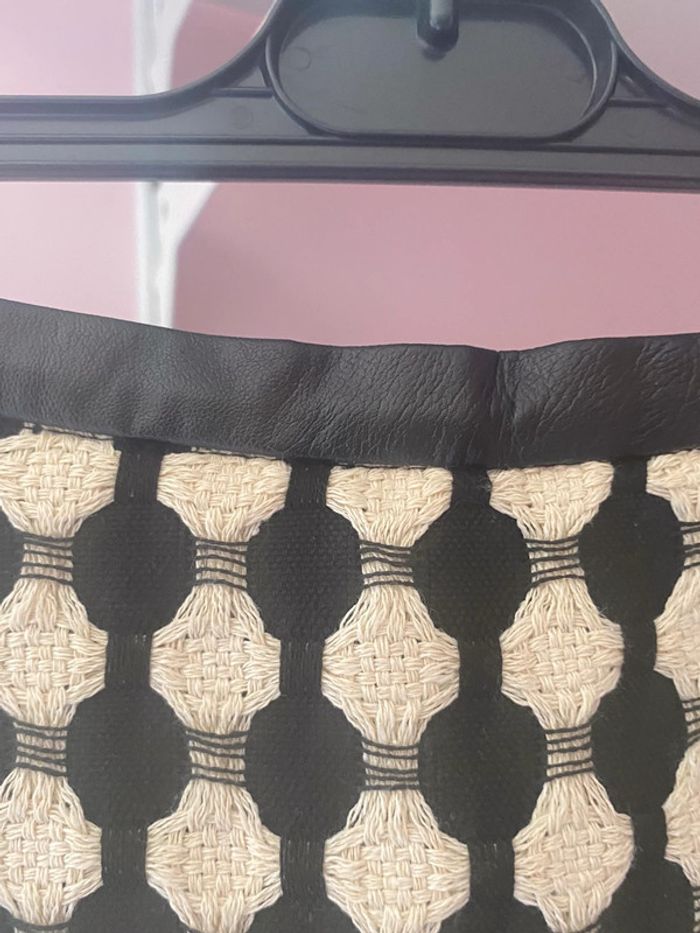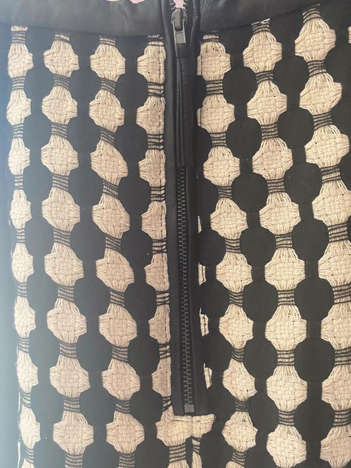 jupe droite classique noir et blanche avec au niveau de la ceinture un empiècement en simili cuir et également au niveau de la fermeture