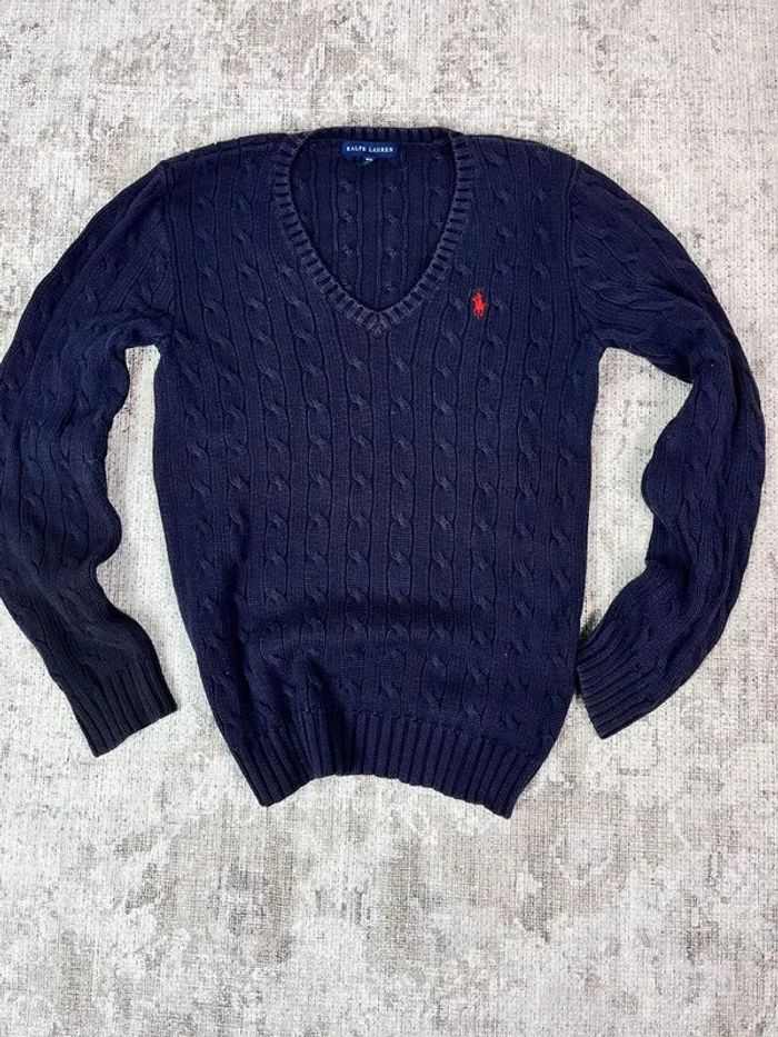 Pull col en V ralph lauren bleu marine logo brodé rose taille XL 489C - photo numéro 1