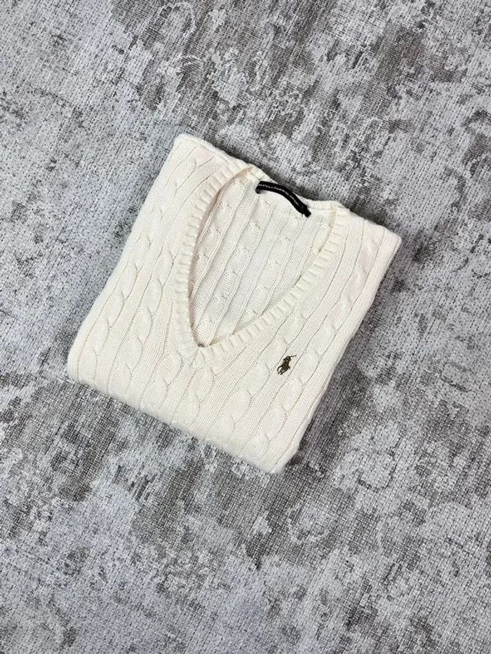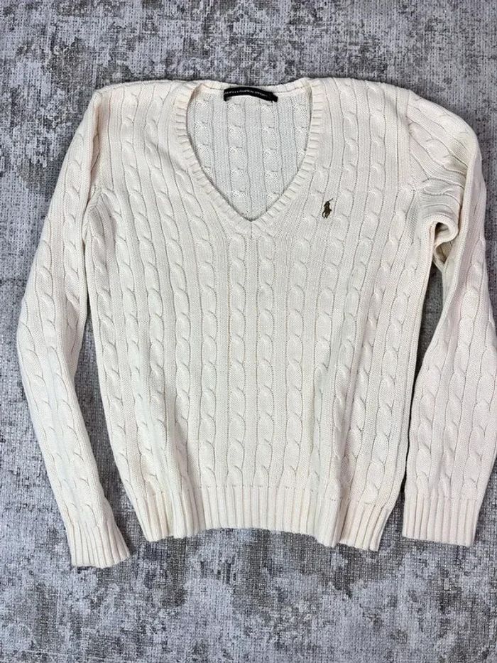 Pull col en V ralph lauren beige logo brodé marron taille L 466D - photo numéro 1