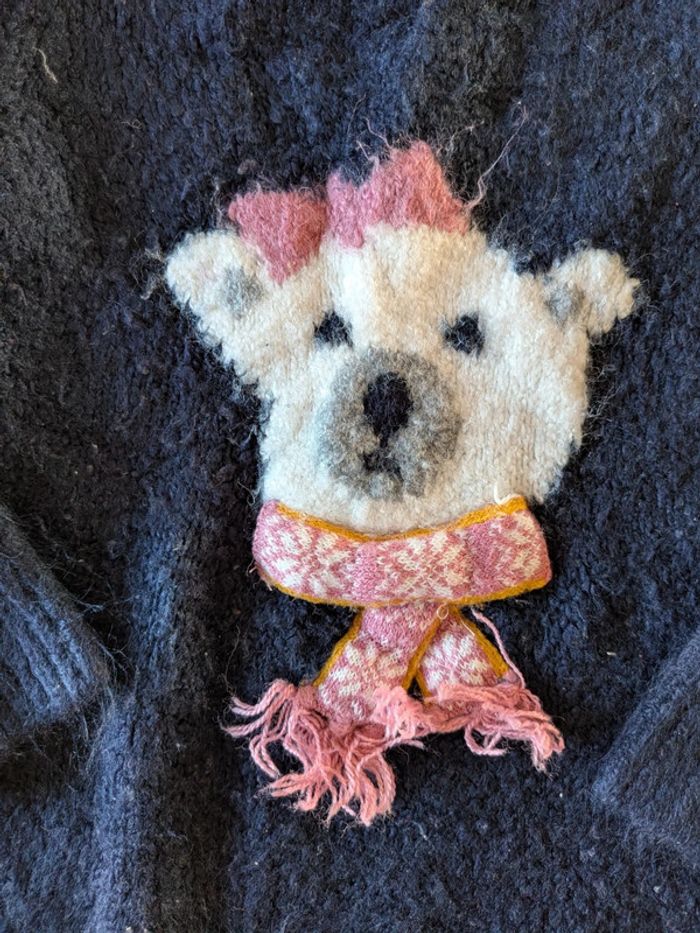 Robe hiver avec motif devant. manche longue. Un peu beloché.
