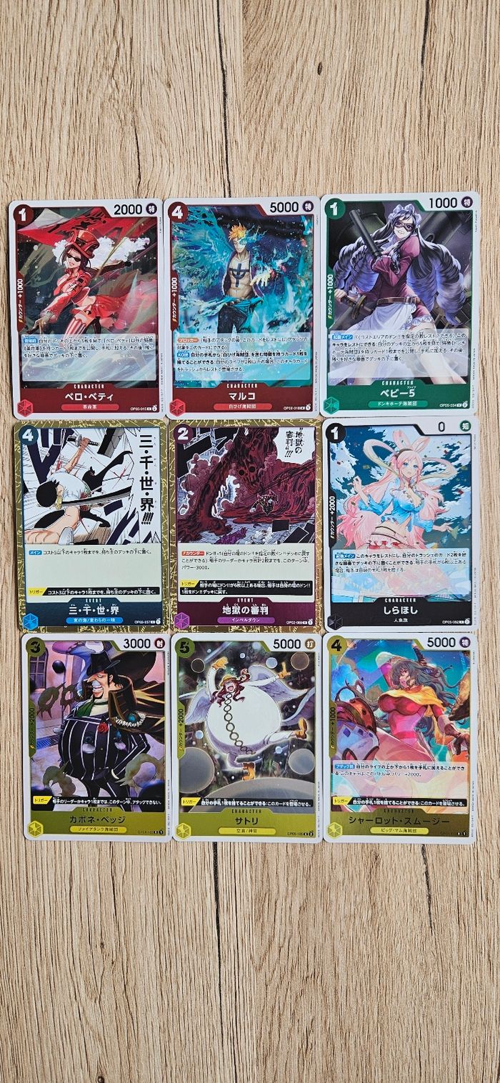 🔥 Cartes officielles OnePiece Card Game PRB01 (Japonaise) 🔥 📦 Contenu du lot : - 1 Shanks (OP01-120 SEC) - 6 SR - 13 Foil dont 7 Rares - 9 Don!! - 58 Cartes basiques dont 9 Rares 😄 Aucune Carte en double 😄 🃏 Cartes en parfait état, idéal pour collectionneurs débutants ou confirmés. 📮 Envoi rapide et soigné. Pour plus de renseignements contactez-moi ! 👋🏼 Découvrez aussi d'autres articles disponibles sur mon profil pour encore plus de choix 💪🏼