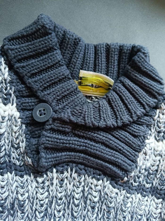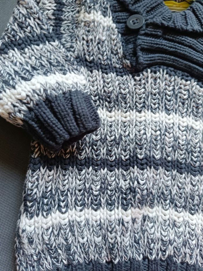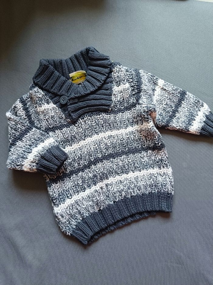 Pull bleu gris rayé. En très bon état. Taille 3 mois (59 cm) 🦕 Réduction sur les lots dès 2 articles achetés