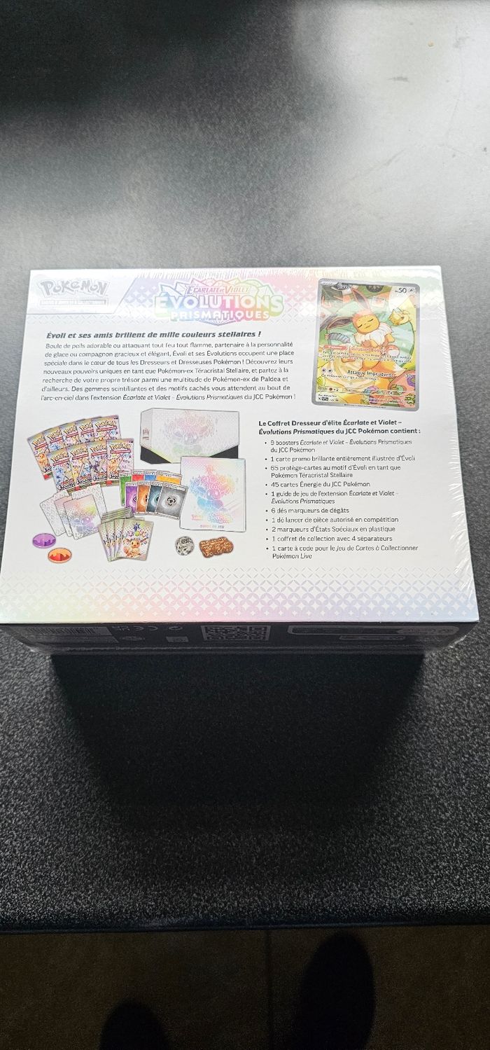 EtB pokemon évolution prismatique neuf sous scellé plusieur disponible Contient : 9 boosters 65 protège carte 45 cartes énergie 1 guide de jeu 6 dés marqueurs de dégâts 1 dé de lancer 2 marqueurs d’état spéciaux 1 coffret avec séparateur 1 carte à code