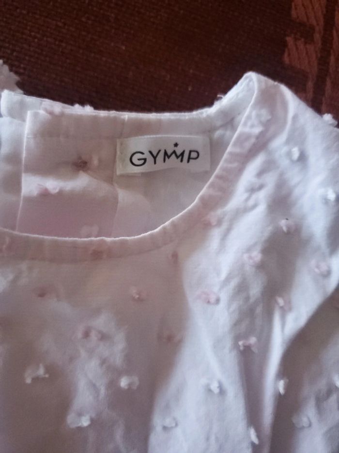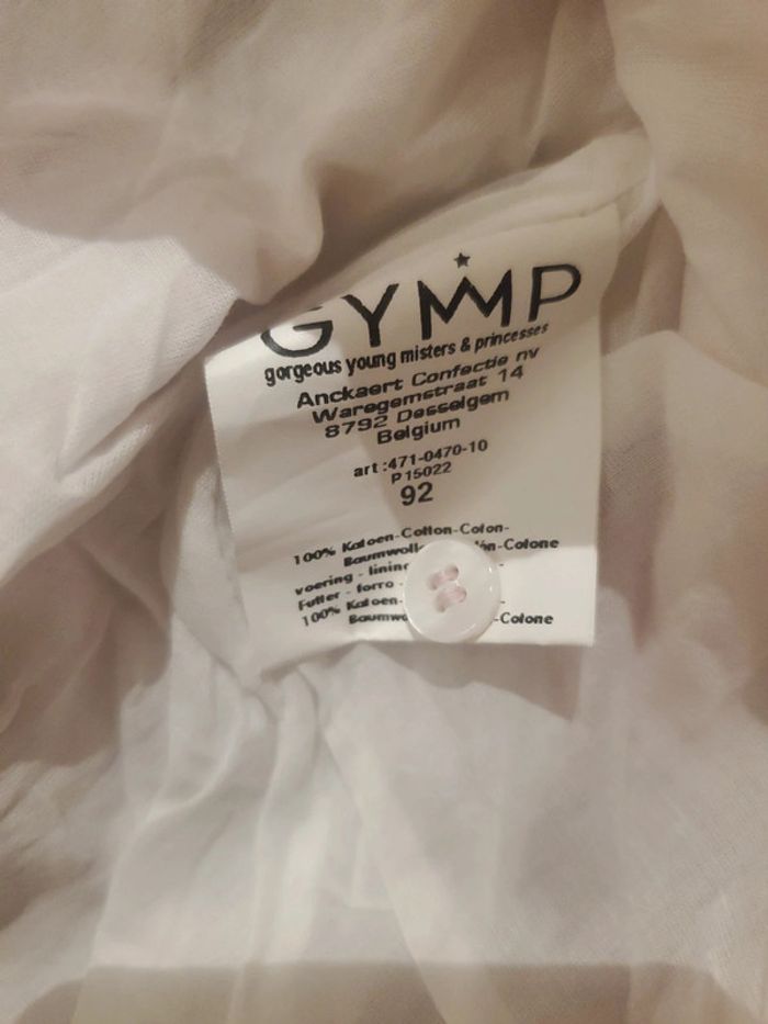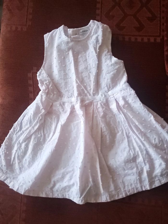 Jolie robe d'été GYMP en coton. Rayures discrètes alternant rose pâle et blanc. Les points brodés alternent de couleurs de façon opposée à la rayure essayer d'augmenter la luminosité pour voir (point blanc sur rayure rose etc) Bouton de rechange sur étiquette Taille 24mois / 92 cm Très bon état