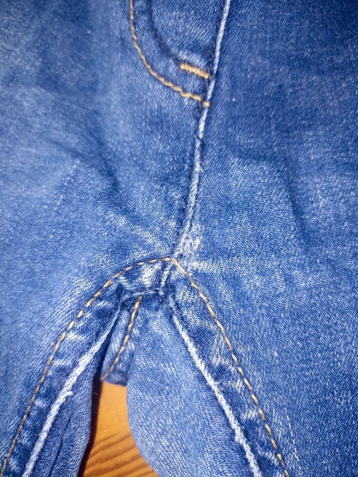 Jean effet usé, il faut recoudre un petit peu au niveau de l'entrejambe, petit accro sur le bas voir photos sinon excellent état
