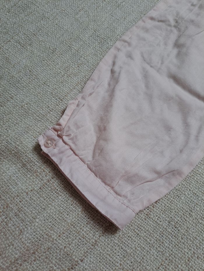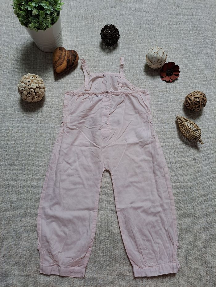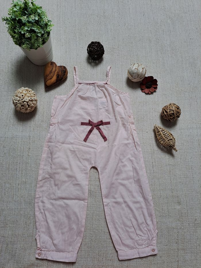 Combi pantalon Vertbaudet en taille 24 mois. Elle est rose pâle avec des détails parme. Élastiques sur les côtés. Boutons pressions dans le dos. Tissu léger et un peu transparent. En très bon état.