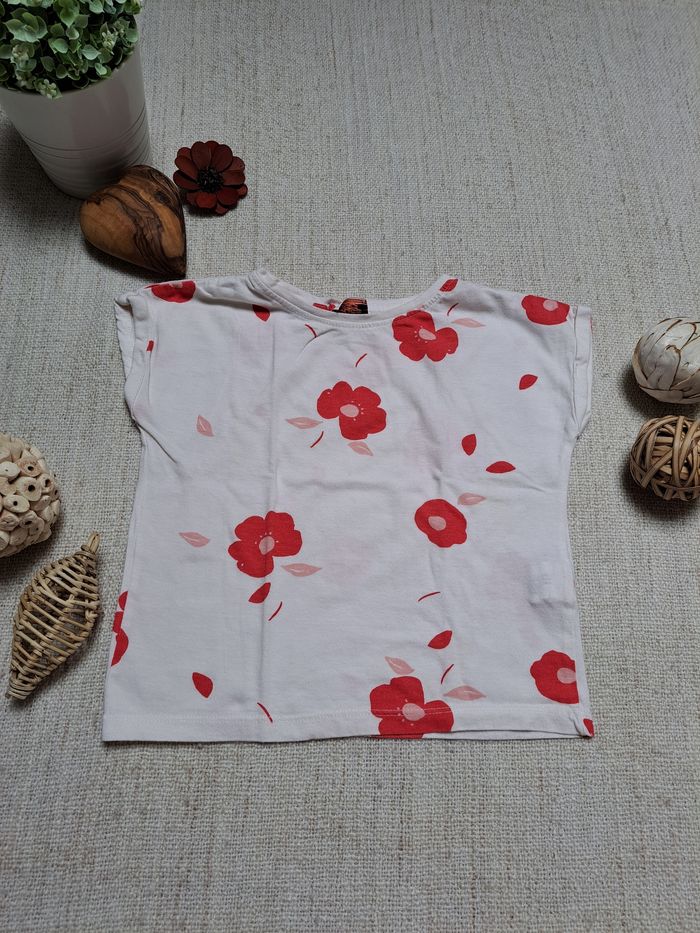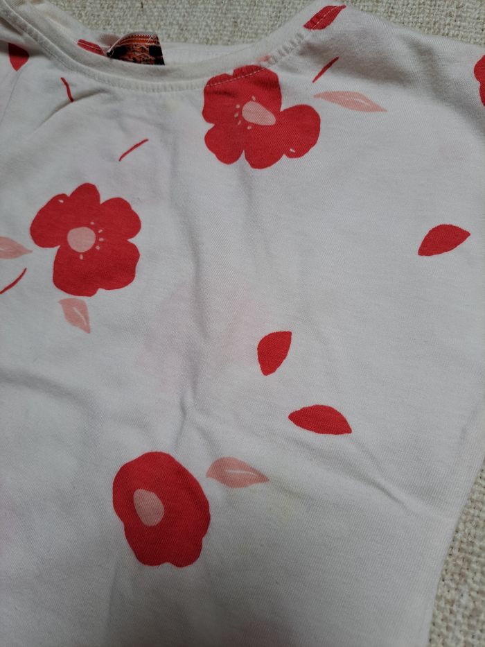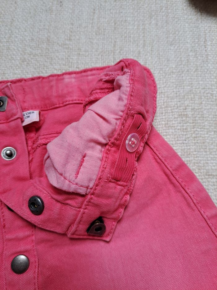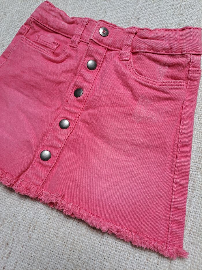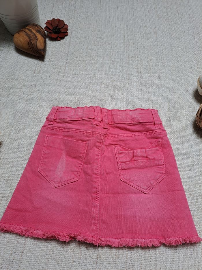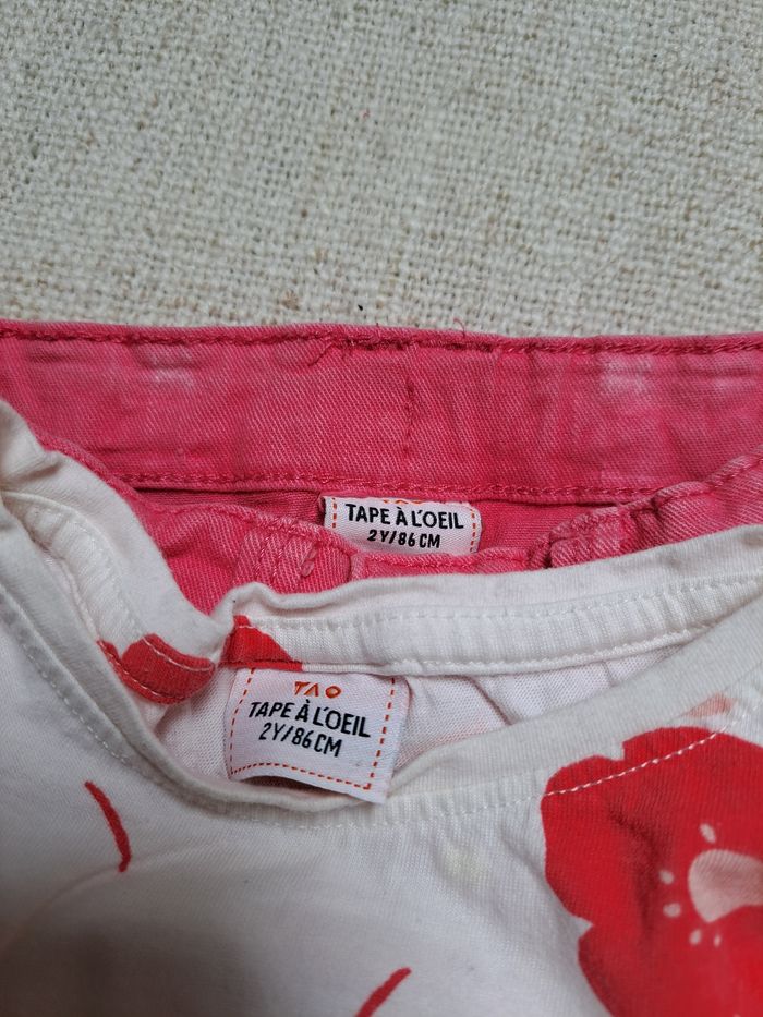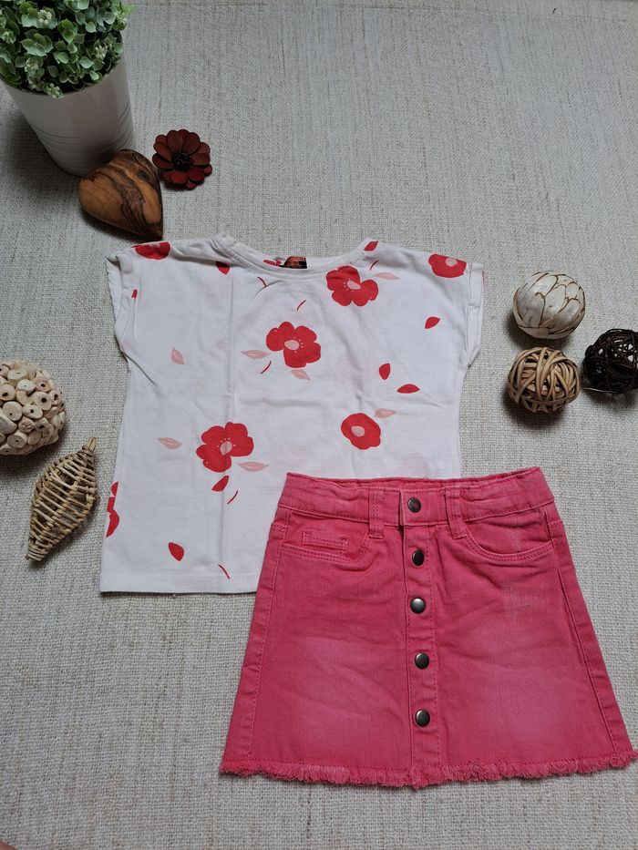 Ensemble Tape à l'œil en taille 2 ans. 🌼 Jupe en jean rose. Effet usé et découpé dans le bas. Taille réglable. En très bon état. 🌼 T-shirt manches courtes blanc avec un imprimé fleuri dans les tons roses. Légèrement taché (voir photos).