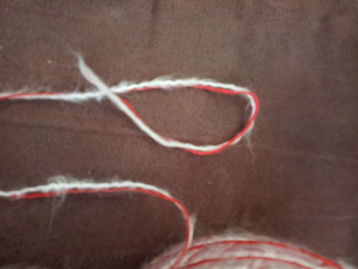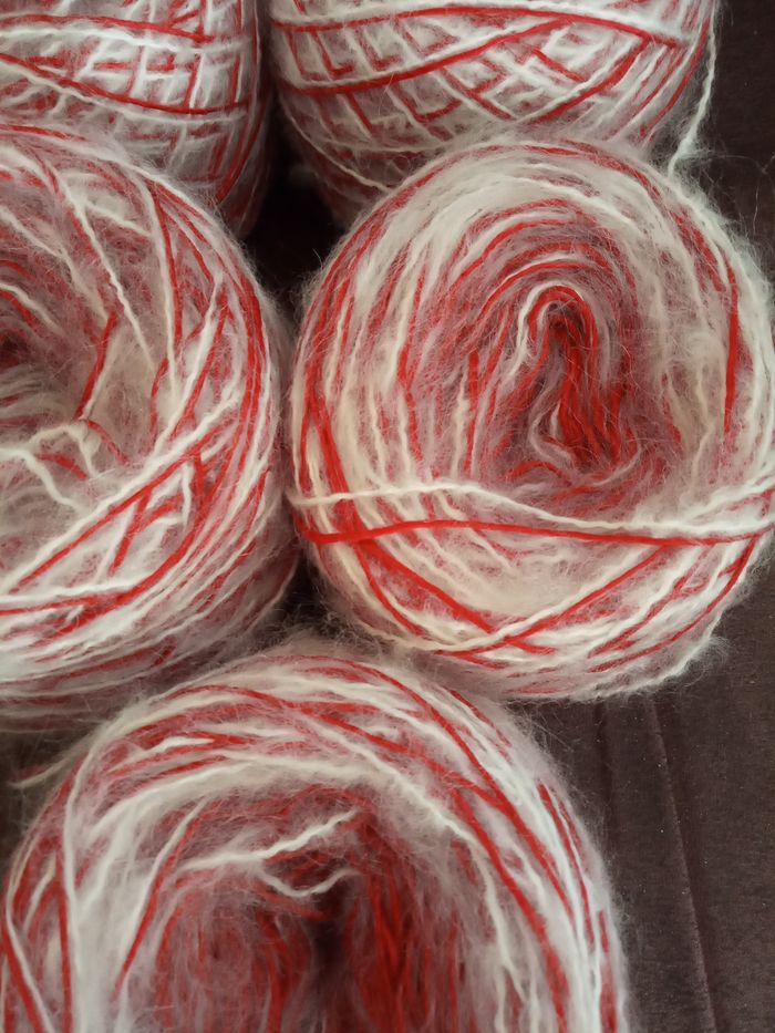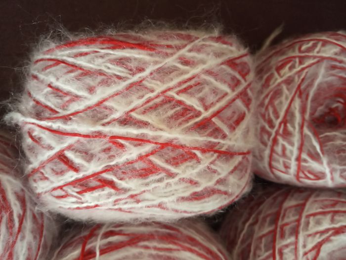 Lot de 5 Pelotes Fantaisies (420g) Couleur: Rouge et Blanc 1 fil simple plutôt fin + 1 autre fantaisie fin aussi Très douce au touché au total 420g Aiguilles 2,5-3 environ Lot en parfait état