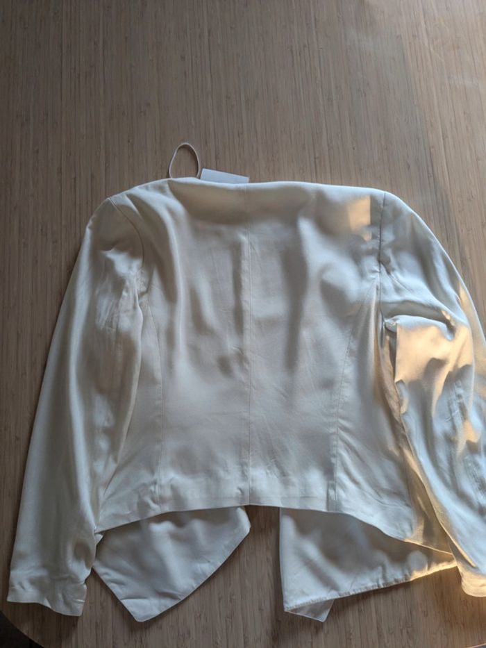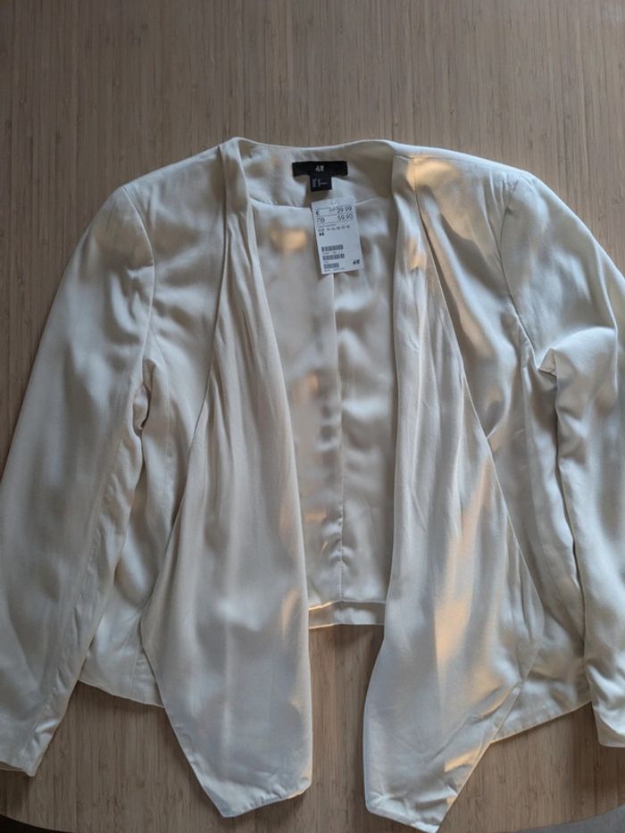 Bonjour, Je vends une veste type blaser fluide, couleur blanc/beige, neuve avec étiquette. Marque H&M Taille 44