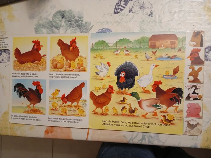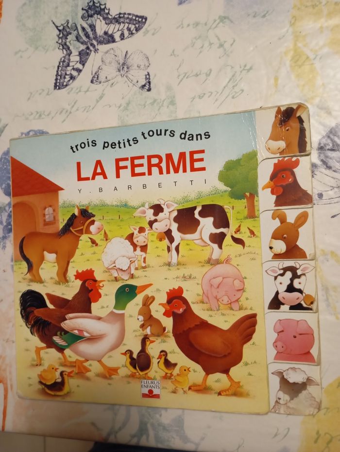 Livre cartonné trois petits tours dans la ferme Pour apprendre tout en lisant et s'amusant la vie à la ferme du cheval poule lapin vache cochon mouton Très ludique Très bon état ms couverture un peu abîmée Bcp d'autres livres