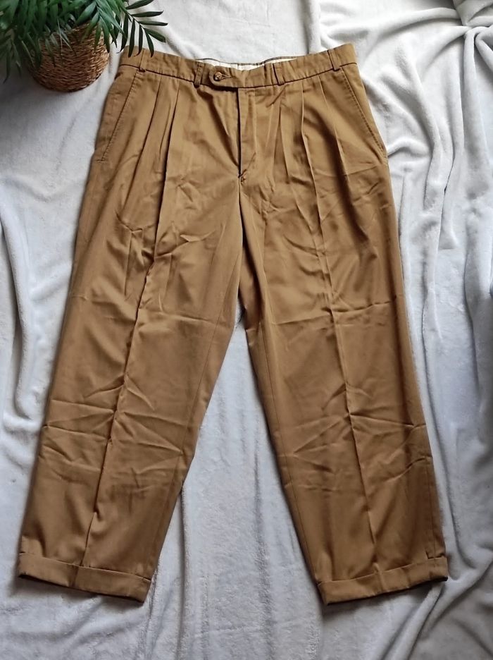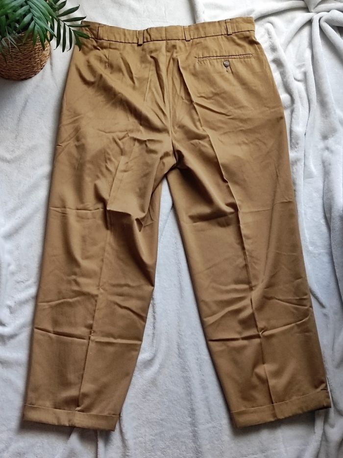 pantalon de costume / chino vintage de couleur marron / camel avec poches sur le côté ainsi qu'une à l'arrière côté droit. Fermeture éclair, crochet et bouton. Marque canda de C&A en taille 46. En parfait état car porter une fois pour une occasion.