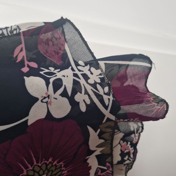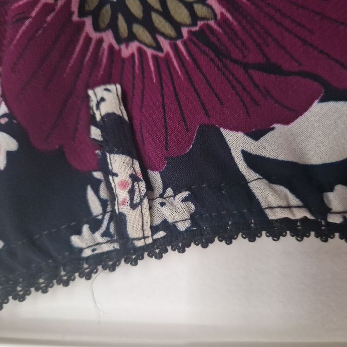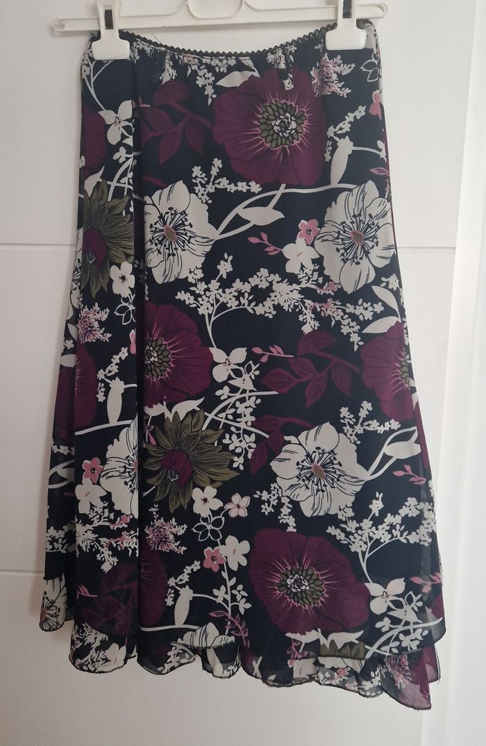 upe en mousseline à 1 volant, taille élastiquée finition dentelle noire, à enfiler - Passants à la ceinture Coloris : marine, pourpre, blanc et kaki motifs fleurs 100% polyester = lavable en machine et repassage inutile Taille M - mesure à la taille 31 cm largement extensible, longueur = 72 cm Excellent état / comme neuve, aucun défaut.