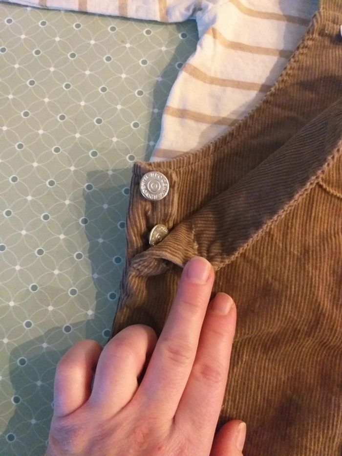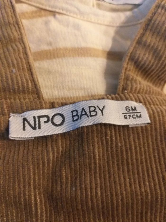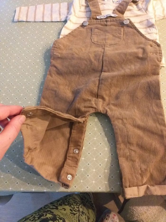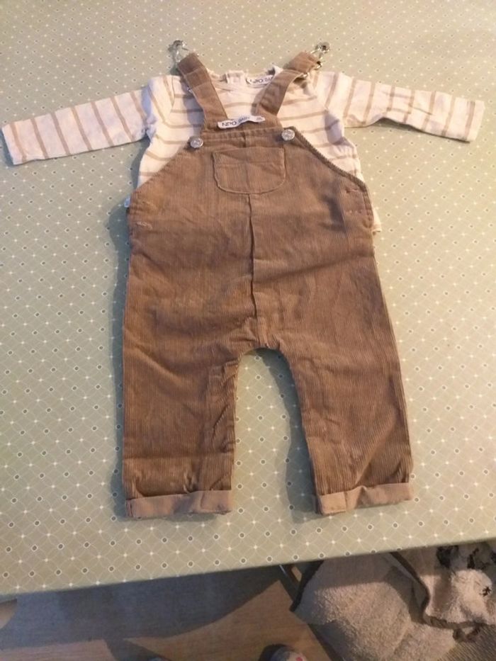 Ensemble salopette/tee-shirt en 6 mois. Tee-shirt manches longues rayé marron/crème. Salopette marron effet daim. Neuf juste lavé. Offert par ma mère et j'ai pas eu l'occasion de la mettre à mon fils et à présent l'ensemble est trop petit.