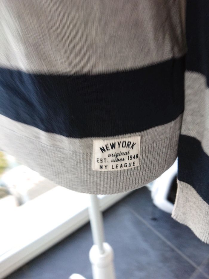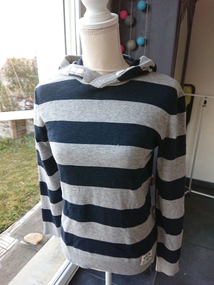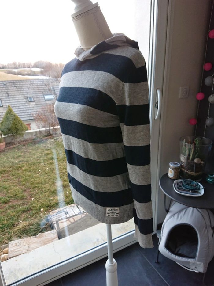 Jolie pull capuche idéal pour intersaison de couleur gris et bleu Petit côté sportwear ou plus habillé selon les associations taille S carrure 1 m 65