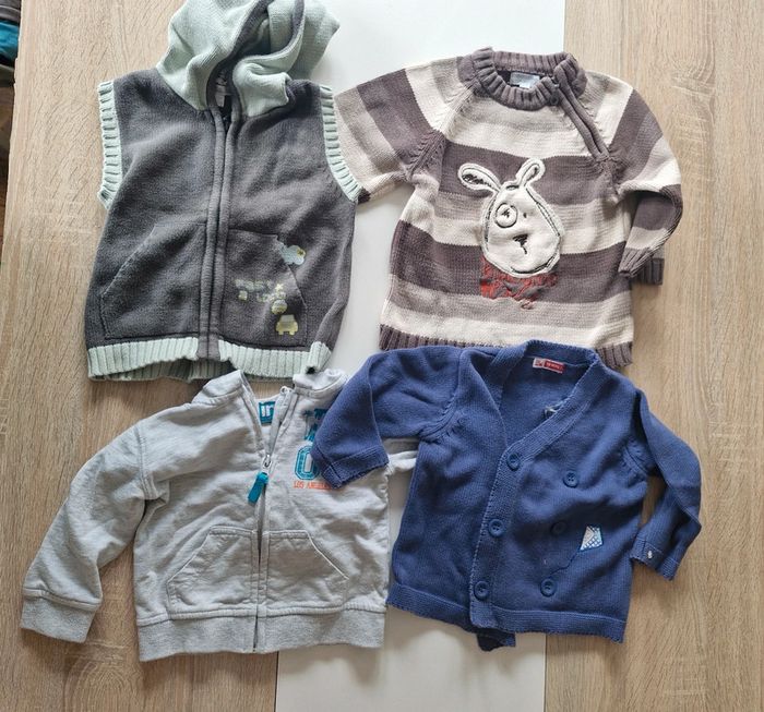 #melany71_18mois Je l'ai sans manche à capuche épais taille 18 mois marque Kitchoun pull avec un lapin marque Kimbaloo gilet gris marque in extenso gilet violet marque DPAM