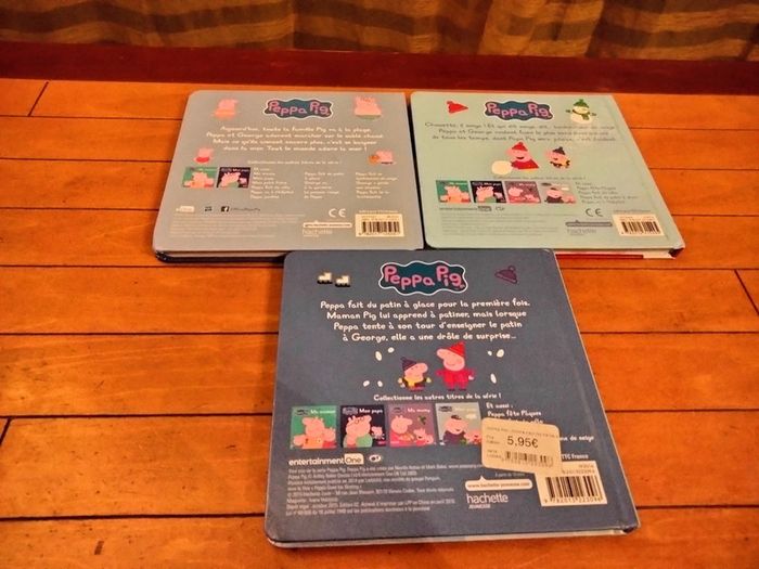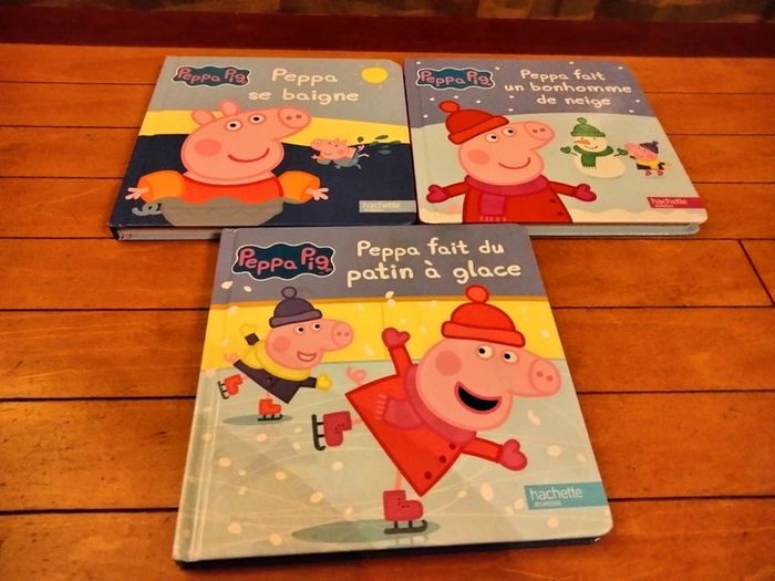 Bonjour Peppa se baigne Peppa fait un bonhomme de neige Peppa fait du patin à glace Acheté neuf 5.95€ pièce J'ai également des figurines de Peppa pig