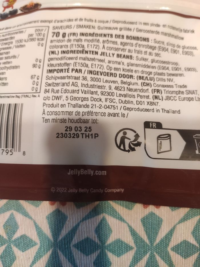 2 paquets de jelly belly marshmallow DLUO 29 mars 2025. Vendu avec un paquet de water drop à La mure et 3 doses framboises fleur de sureau. J'offre en cadeau un jelly belly assorti avec une date limite de juillet 2024, dépassée donc