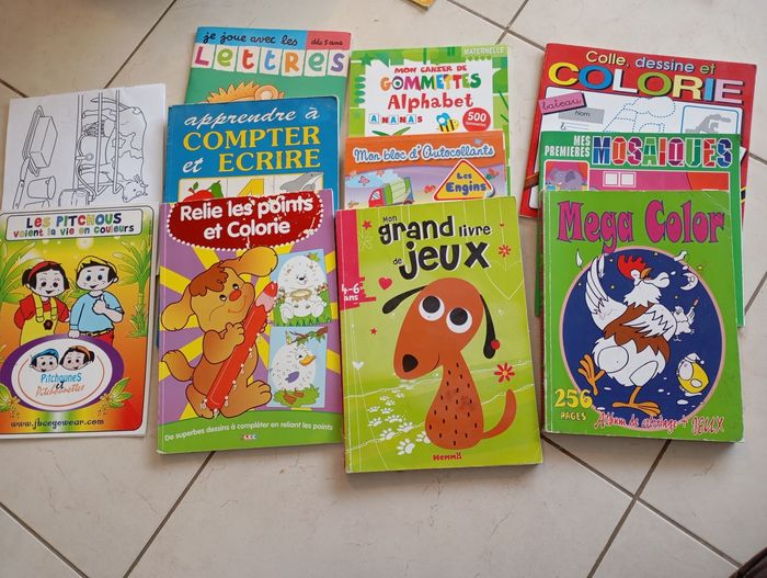 Gros lot qui comprend 11 livres d'activités Coloriage Relie les points Apprendre à compter et écrire Je joue avec les lettres Mon cahier de gommettes Mon bloc d'autocollants Mon grand livre de jeux Colle dessine et colorie Mes premières mosaïques Album de coloriage et jeux 256 pages Ils sont tous commencé ms ils restent énormément de pages à faire dans tous.
