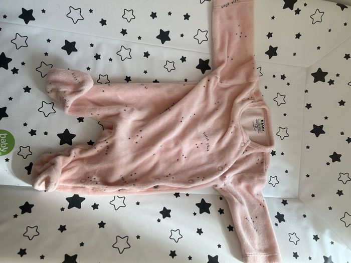 Pyjama kiabi 1 mois Quasiment neuf, ma fille étant née à 54cm pour 3kg780, elle ne l’a porté que 15 jours. Il y a juste un défaut de couture sur la manche (cf photo) Lavé avec une lessive hypoallergenique spécial bébé. Possibilité de faire un lot (tarif baissé).
