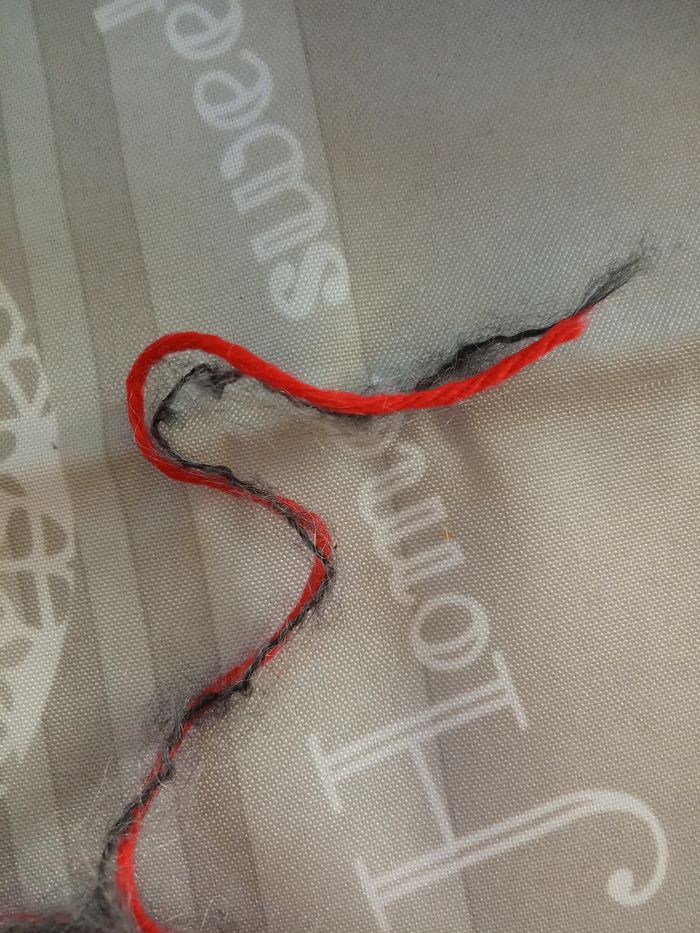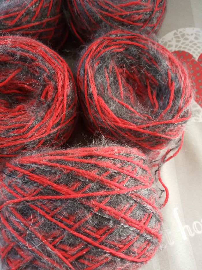 Lot de 7 Pelotes Fantaisies (480g) Couleur: Rouge et Gris Foncé 2 fils de taille différente au total 480g Aiguilles N°2,5-3 environ Lot en parfait état