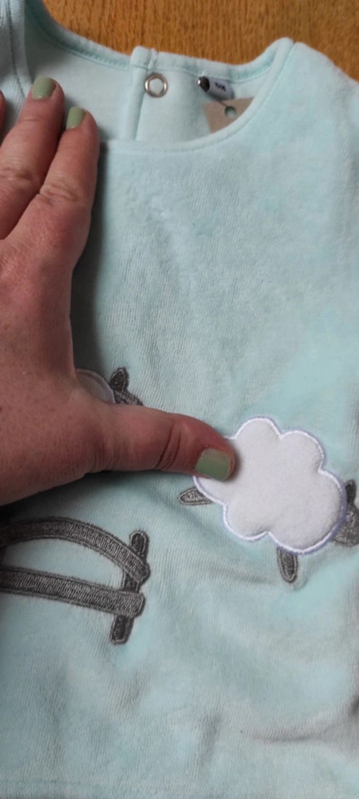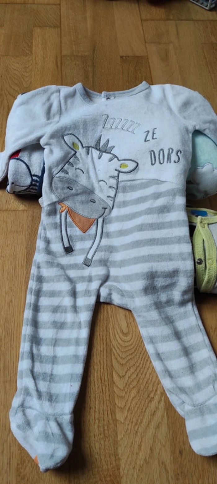 2 pyjamas une pièce 1 pyjama deux pièces : présente une mino tâche et le velour commence à s'abîmer dans le stockage alors qu'il n'a été porté que une fois Un sur pyjama Diverses enseignes 👶🕓 Taille 6 mois #audry88mois6 🎨 📸Les couleurs peuvent varier un peu malgré mes tentatives pour régler l'appareil photo et le flash de mon téléphone... 🙈 🧺Les vêtements ne sont pas repassés ! 🧑‍🚒🌟 Maison non fumeur.