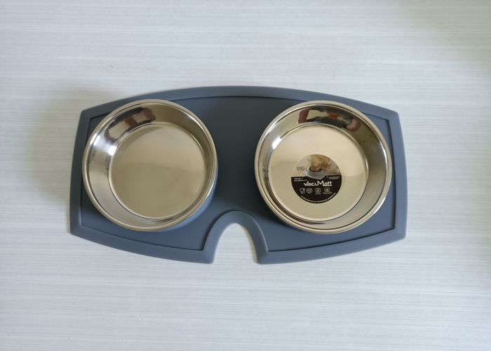 NEUF. GAMELLE ET ABREUVOIR. TAPIS SILICONE ANTIDERAPANT GRIS. INOX. VACUMATT. 2 x 850 ML. DIMENSIONS GAMELLES : 17,5 x 4,5 CM. DIMENSIONS TAPIS : 48 x 26 x 4,5 CM. PASSE AU LAVE VAISSELLE. SANS BPA. ENVOI SOUS 24 / 48 HEURES. REMISE EN MAIN PROPRE. cel