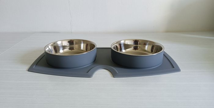 Set de 2 gamelles et support antidérapant gris. Inox. 2 x 850 ml