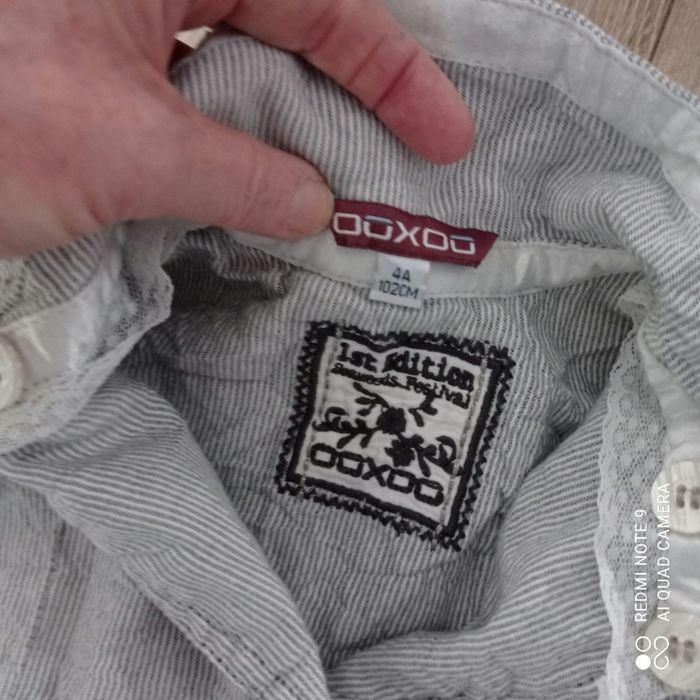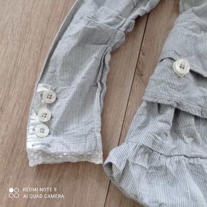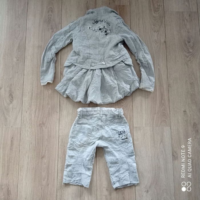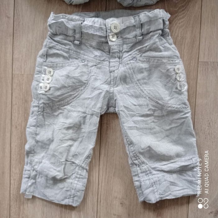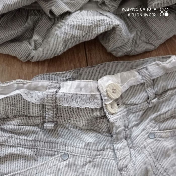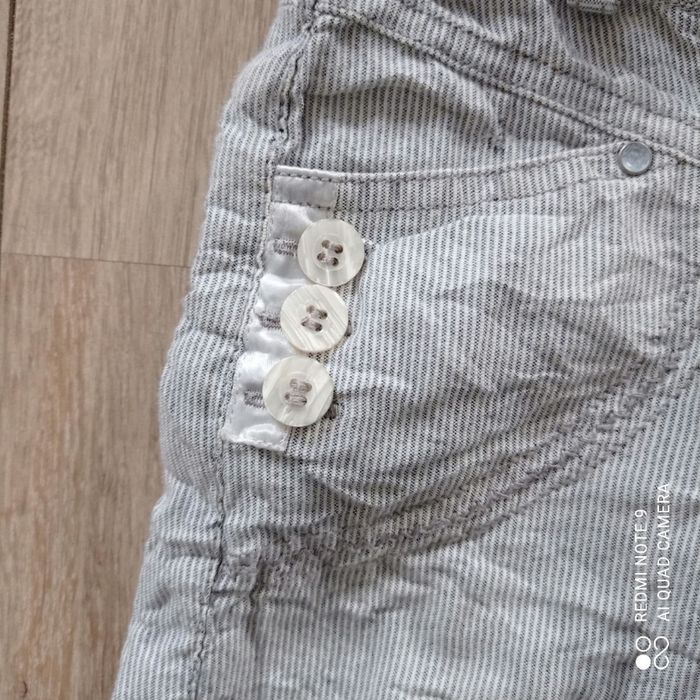 Gris et blanc. Jolis boutons. Jolie dentelle. Veste et pantalon court assorti.