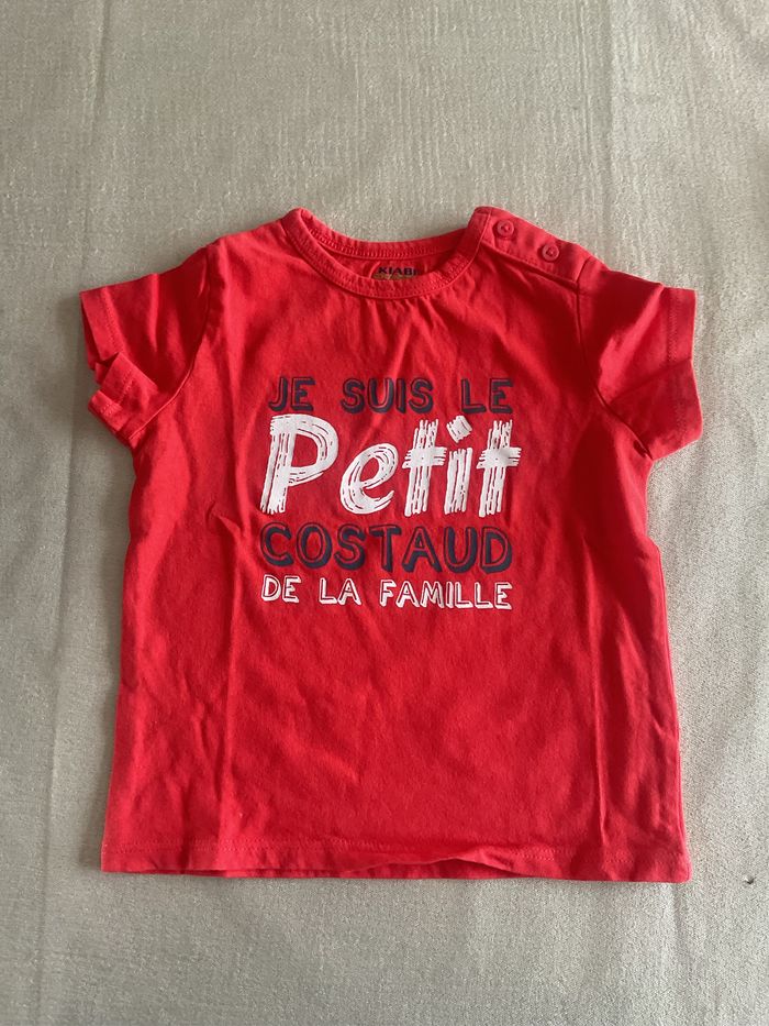 👕 T-shirt manches courtes garçon 👕 T-shirt manches courtes pour petit garçon. Ouverture latérale de l’encolure à gauche par boutons. Inscription « je suis le petit costaud de la famille ». ➡️ Taille: 80 cms ➡️ Marque: In Extenso ➡️ Coloris: Rouge, Noir, Blanc ➡️ Composition: 100% coton Je propose des envois par Mondial Relay ou Relais Colis N’hésitez pas à me contacter pour d’éventuels renseignements 🙂
