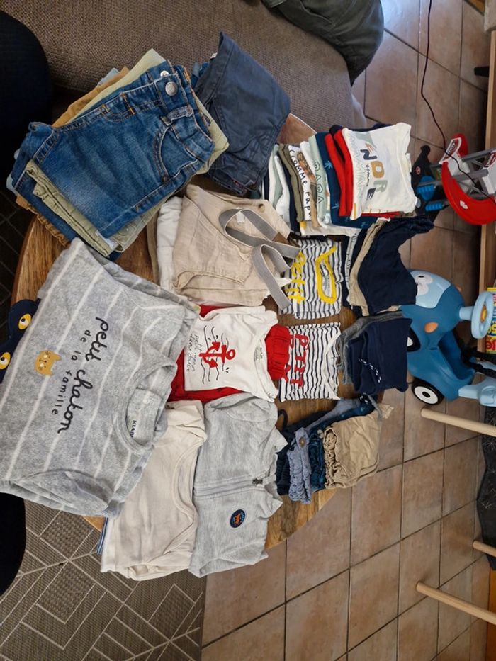 Le lot de vêtements 18 mois 55 euros Vêtements en très bon état 3 pyjamas velours 3bodys manches courtes 1 gilet 5 pantalons 2 pantacourts 2 joggings 2 ensembles été 1 combi été 1 tee shirt manches longues 20 tee shirts manches courtes 9 shorts