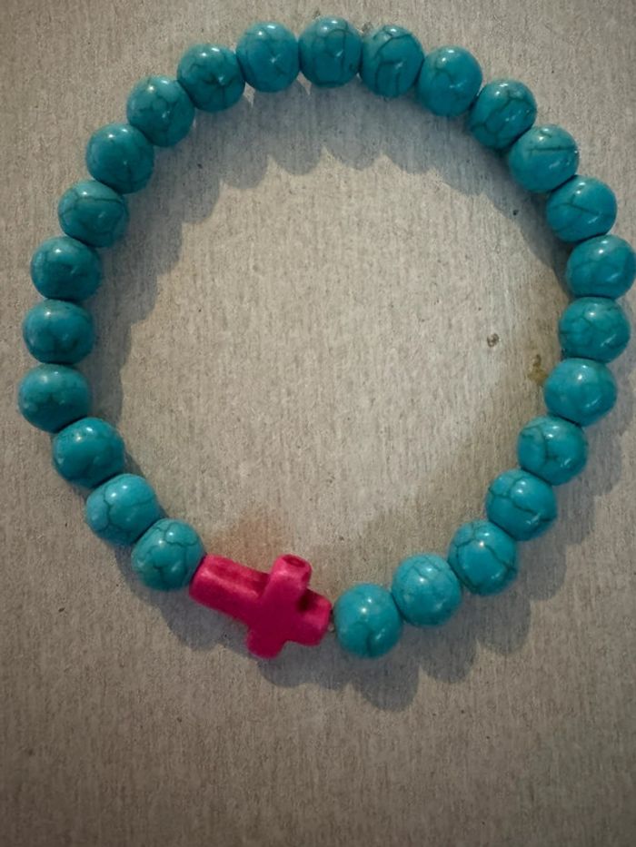 Bracelet perle bleu et croix rose ete tropical elastique - photo numéro 1