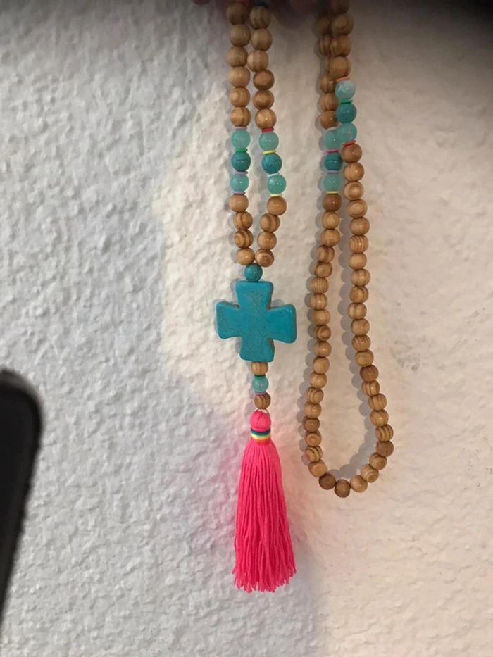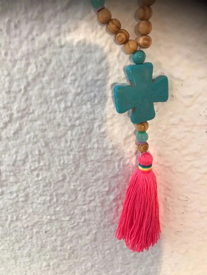Sautoir boho boheme pompom turquoise et rose croix - photo numéro 1