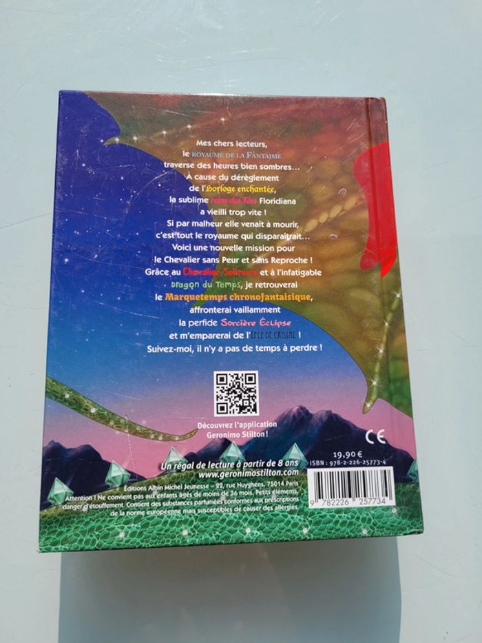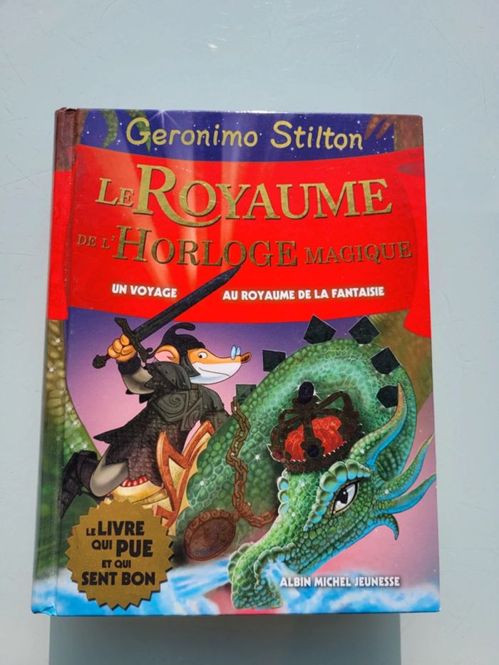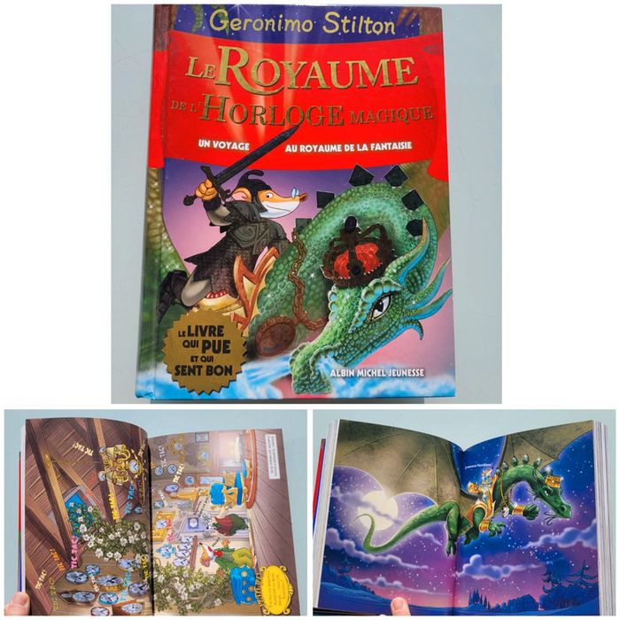 GERONIMO STILTON LE ROYAUME DE L'HORLOGE MAGIQUE UN VOYAGE AU ROYAUME DE LA FANTAISIE Un guide officiel du pays du Temps par Tic Tac, Lutin de première catégorie et zigoto survolté, vient compléter l'aventure en fin d'ouvrage. Au programme, le plan du château du Temps, une présentation des Fées des Heures du Jour et de la Nuit, des recettes, les instructions pour fabriquer un assourissant sablier... Découvre dans ce livre magique le parfum des Fées et la puanteur des Sorcières ! À partir de 8 ans Dimensions ‎15 x 4 x 19.5 cm Relié ‎382 pages Très bon état Mes autres Stilton : #livrestiltonmooglou Mes autres livres enfants : #livreenfantmooglou