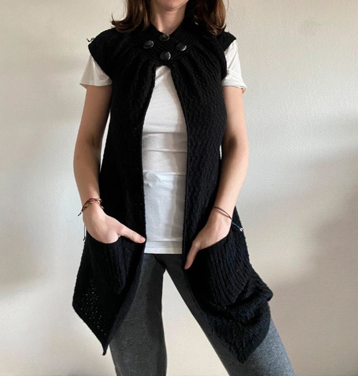 Gilet noir long avec poches , avec boutons en haut au niveau du col Taille unique mais plutot XS/S/M/ voire L selon Moi Pas mal porté mais pas de défauts a part qu'il peluche un peu #gilet #noir #black #long #boutons #alcdiamondsgirls #fashion #tailleunique #basique #woman #femme #mujer #simple #basic #negro #dafnezfemme #dafnez34 #dafnez36 #dafnez38 #dafnez40