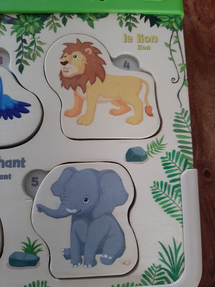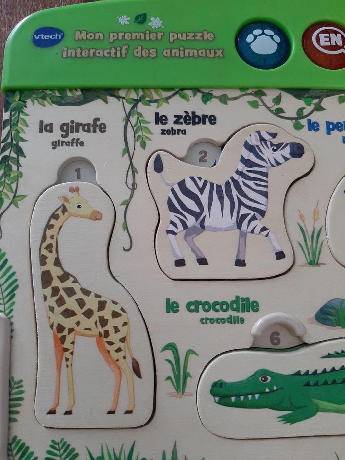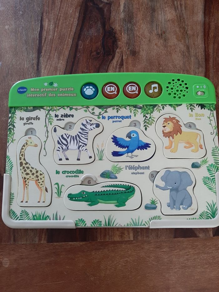 Mon premier puzzle interactif des animaux permet à votre enfant d’apprendre tout en s’amusant. Ce jouet est fabriqué en bois certifié FSC® et en plastique : la partie plastique est fabriquée avec 90% de plastique réutilisé issu de chutes de production pour contribuer à la réduction des déchets. Les six pièces de ce jouet en bois l’aident à développer son sens de l’observation et de la déduction, et encouragent le développement de sa motricité fine. Les quatre modes de jeu et les nombreuses interactions le transportent en compagnie des animaux et lui font découvrir leurs caractéristiques et leur environnement. Jouet d'éveil recommandé de 18 mois Présente des marques d'usure (voire photo)