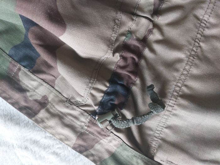 Veste militaire imprimé camouflage. Très bon état. Petite tache de décoloration à l'épaule gauche (voir dernière photo). Taille M/L (voir mesures plus bas). Cordon pour resserrer la taille. Mesures à plat = Largeur aux épaules = 41cm environ. Largeur aux aisselles = 46cm environ. Longueur = 75cm environ. N'hésitez pas à me contacter si vous avez des questions. Je vous répondrai dès que possible.