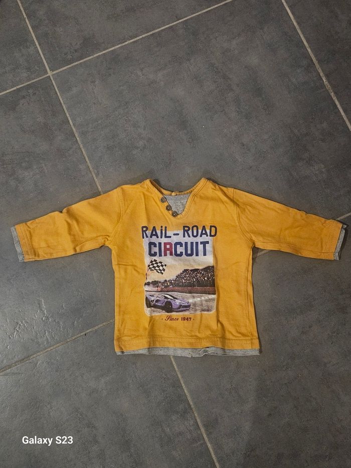 Tee-shirt manches longues circuit de course, peu porté, très bon état Taille 6 mois