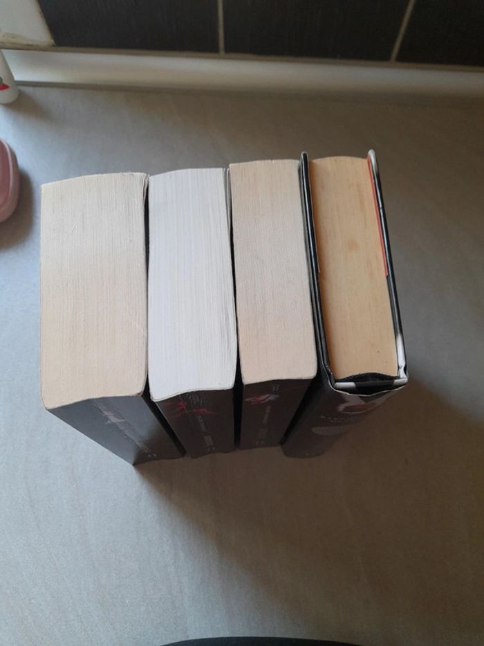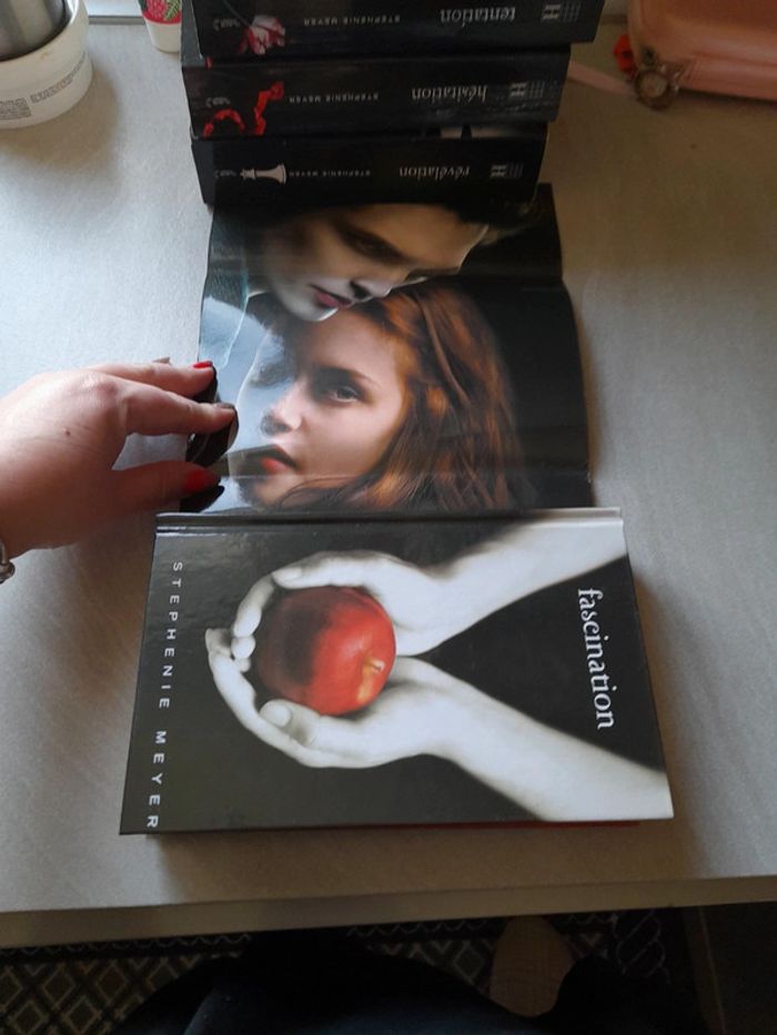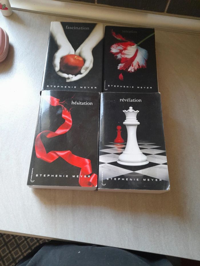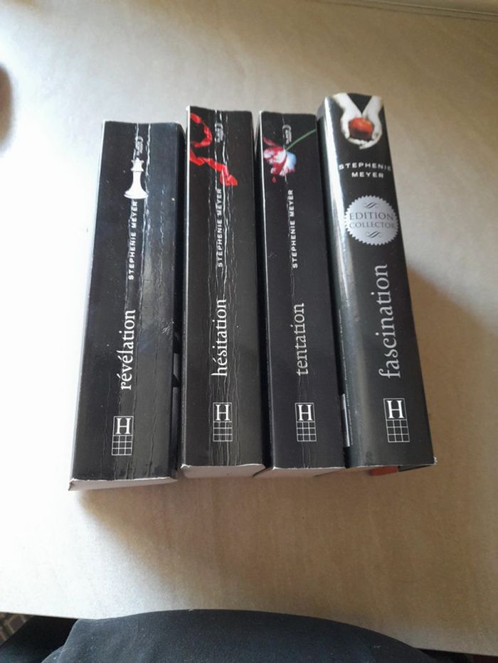 Série complète Twilight Tome 1 Fascination édition collector couverture rigide Tome 2 Tentation Tome 3 Hésitation Tome 4 Révélation Ils sont en format broché, les tranches sont cassé sauf le Tome 1 qui est une couverture rigide. Les tranches des livres sont jaunis mais à l'intérieur ils sont impeccables.