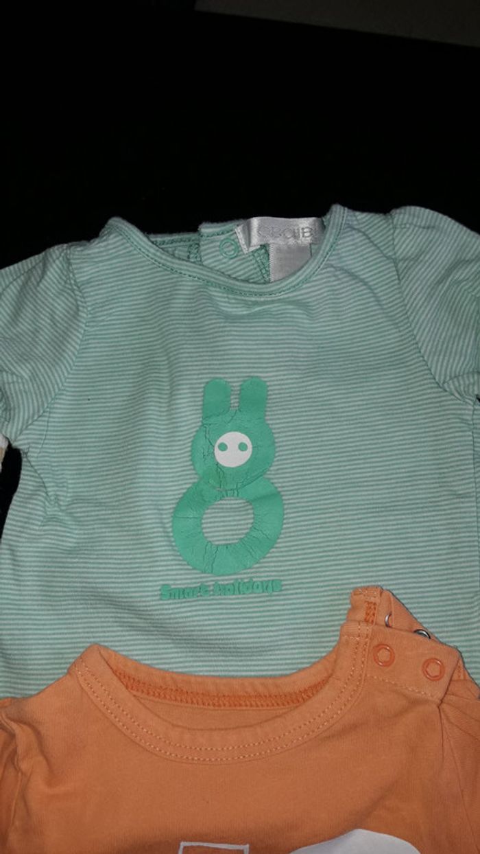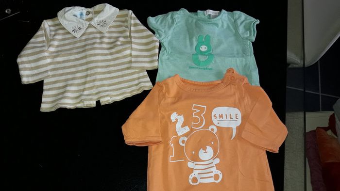 Lot de 3 tee shirts en 1 mois, le vert à le dessin un peu craqué voir photo