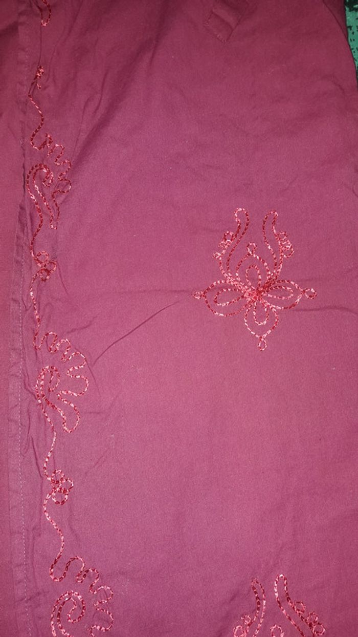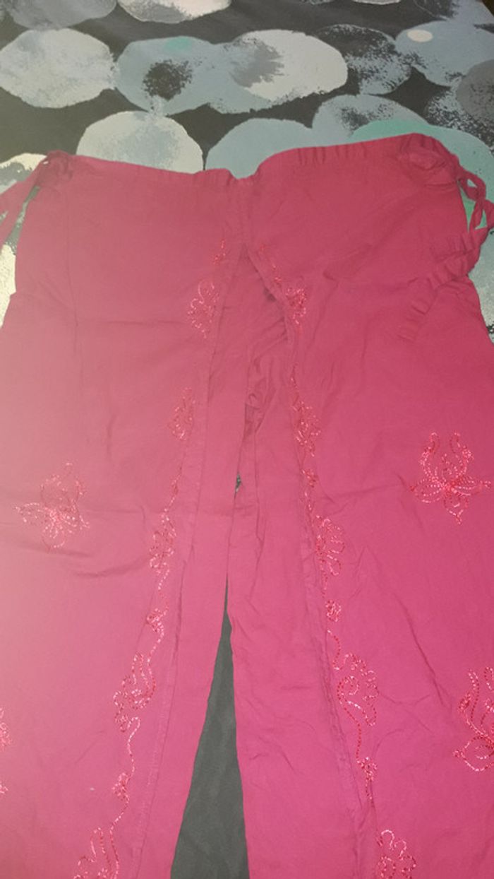 Joli pantalon fuschia avec broderie en taille m/l. Etat neuf, mis 1 seul fois. S'attache à la taille par lien.
