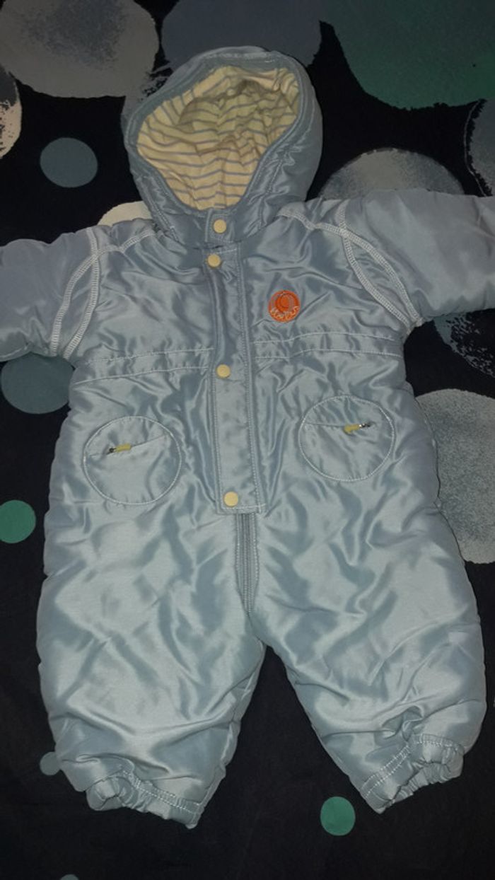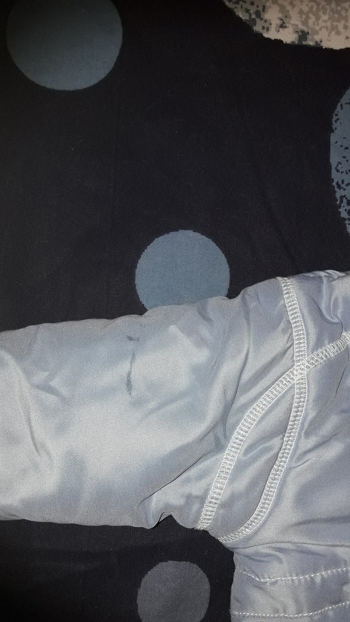 Combinaison en 6 mois. Il y a une tâche sur la manche, voir photo, sinon état impeccable.
