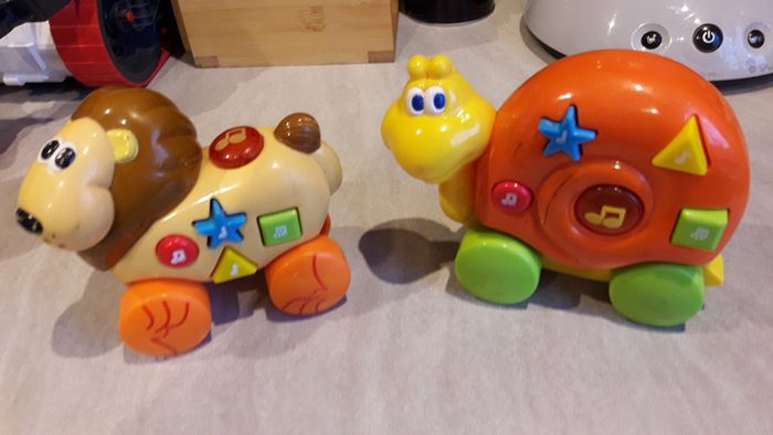 Vend un lion et un escargot a roulettes. Je pense que le système électronique ne fonctionne plus mais impossible à tester sans les bonnes piles.