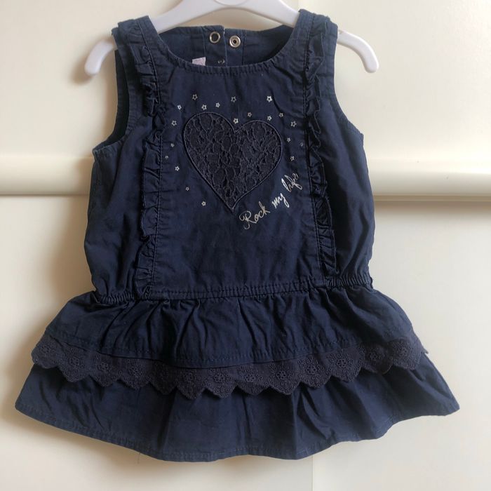 Robe « G baby by Gemo » 3 mois Sans manche, pressions dans le dos Motif: étoile et cœur brodé sur le devant Volant dans le bas Couleur marine